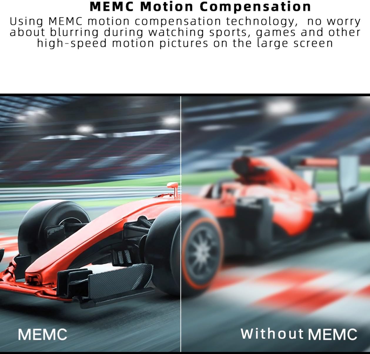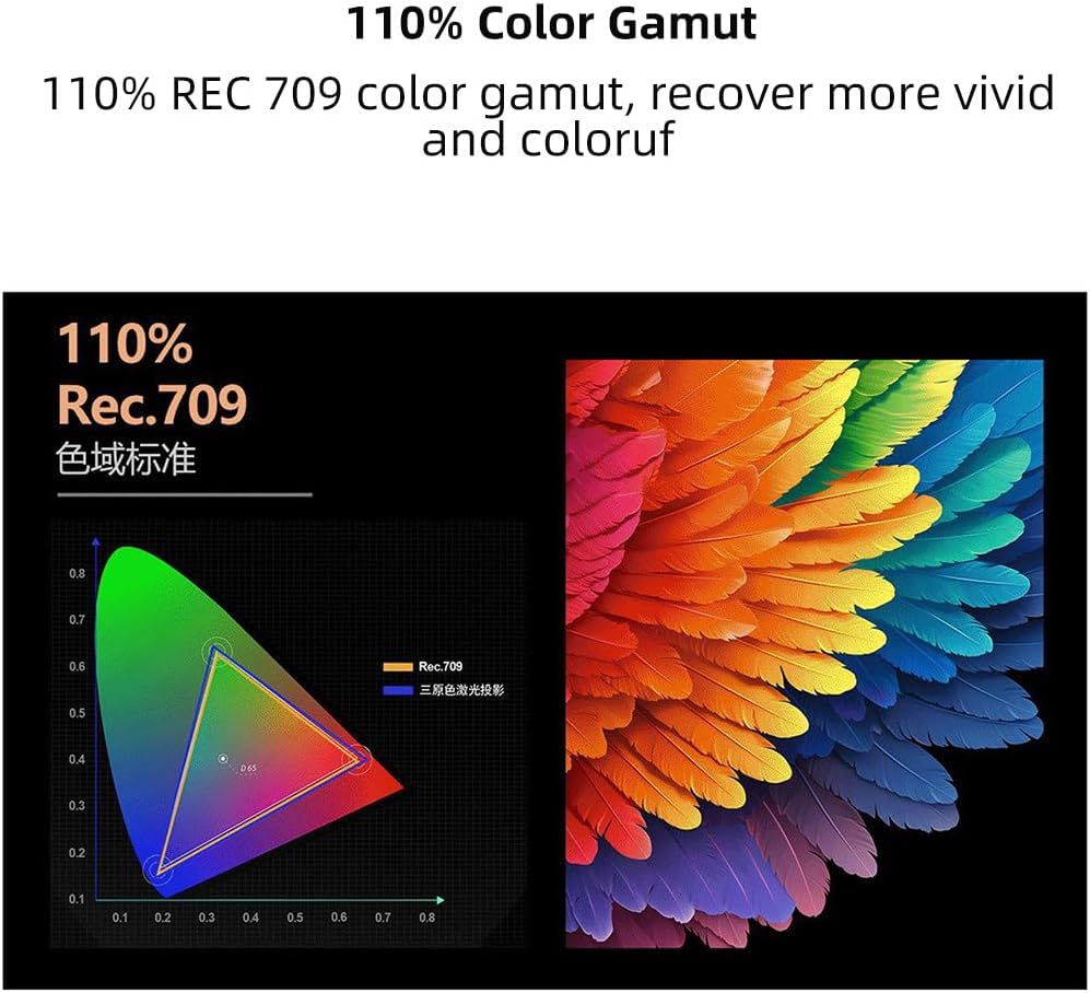 【Eye-Safe & Quiet Operation】 Built in Intelligent laser protection auto -detects movement function, which can auto decrease the brightness once detect the human movement to prevent eye exposure, and make it more friendly and humanized; While the noise levels stay below 32dB, features auto temperature control and shutdown to ensure safe, cool performance during watching, let enjoy more ease.