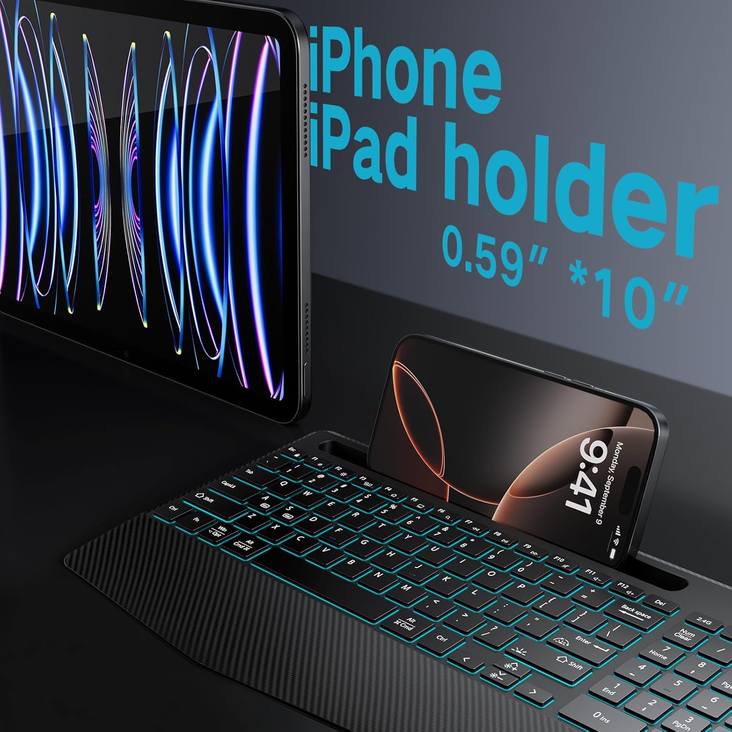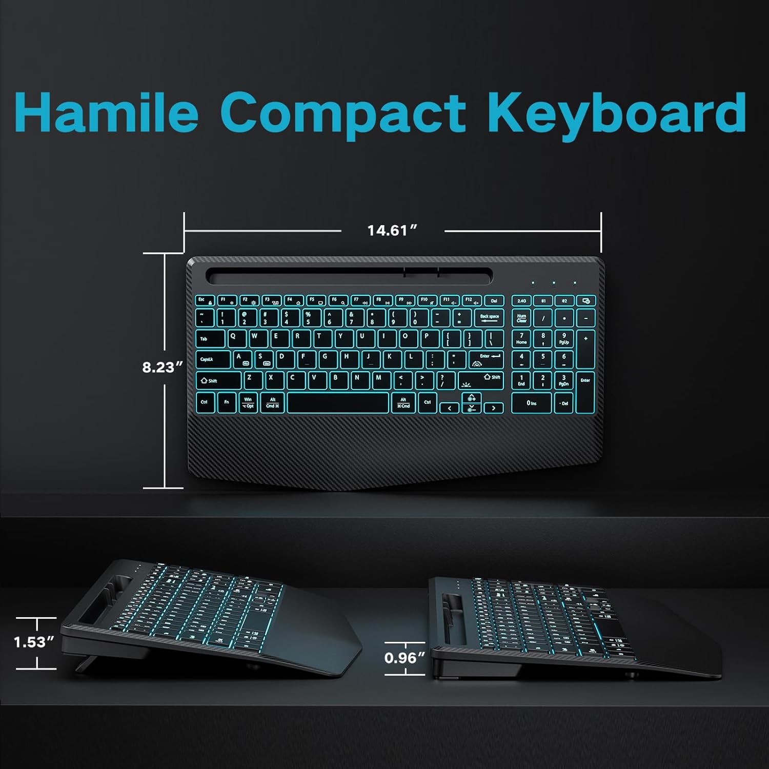 Hamile 2.4G&Bluetooth Wireless Keyboard – Light Up Keyboards with Wrist Rest – 8 Backlit Effects – Slim Rechargeable Silent with Holder for Windows, Mac, Black