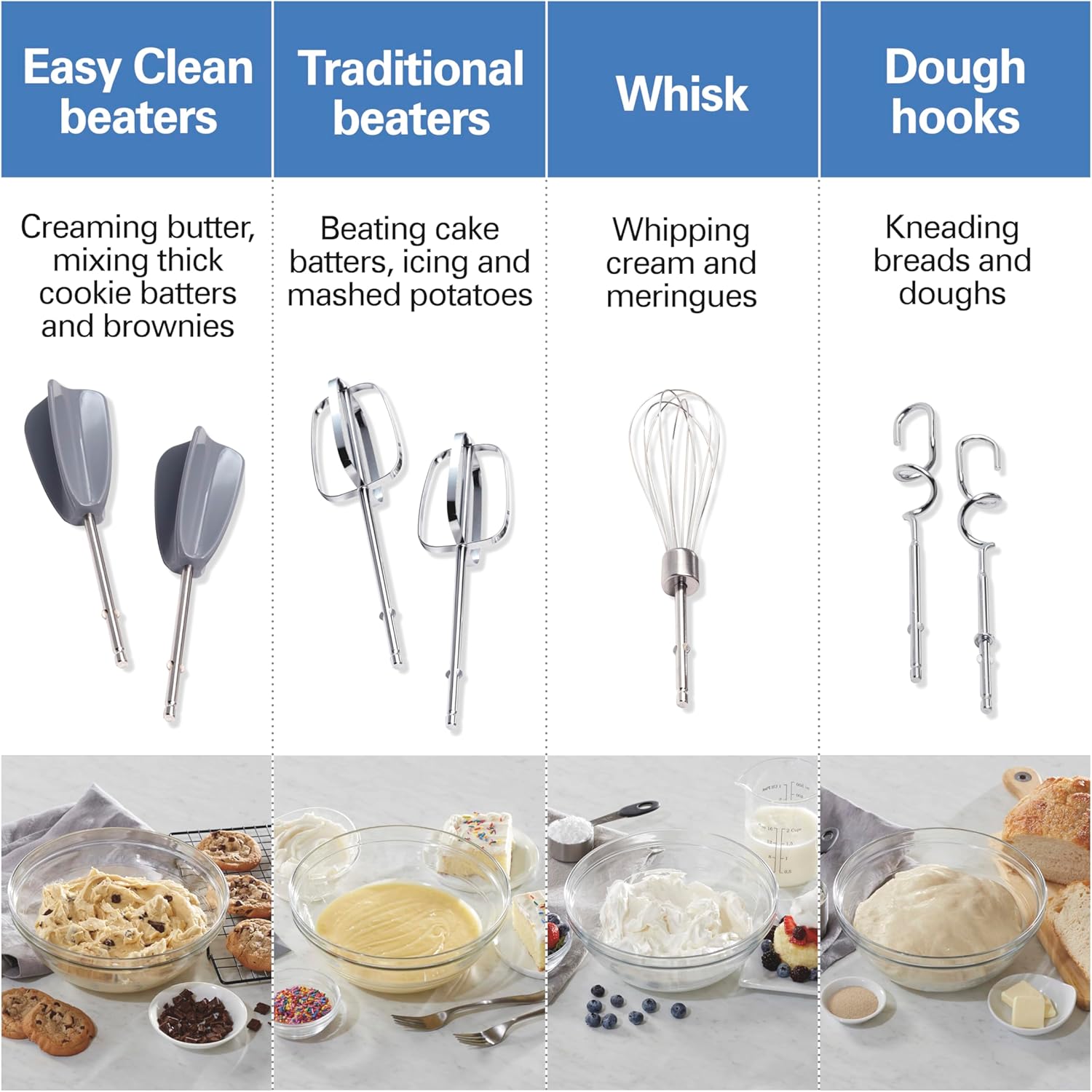 The Hamilton Beach® 6 Speed Hand Mixer has Easy Clean beaters that reduce clogging and the hassle of stopping to unclog beaters. Includes storage case, 2 Easy Clean beaters, 2 traditional beaters, 2 dough hooks and whisk.