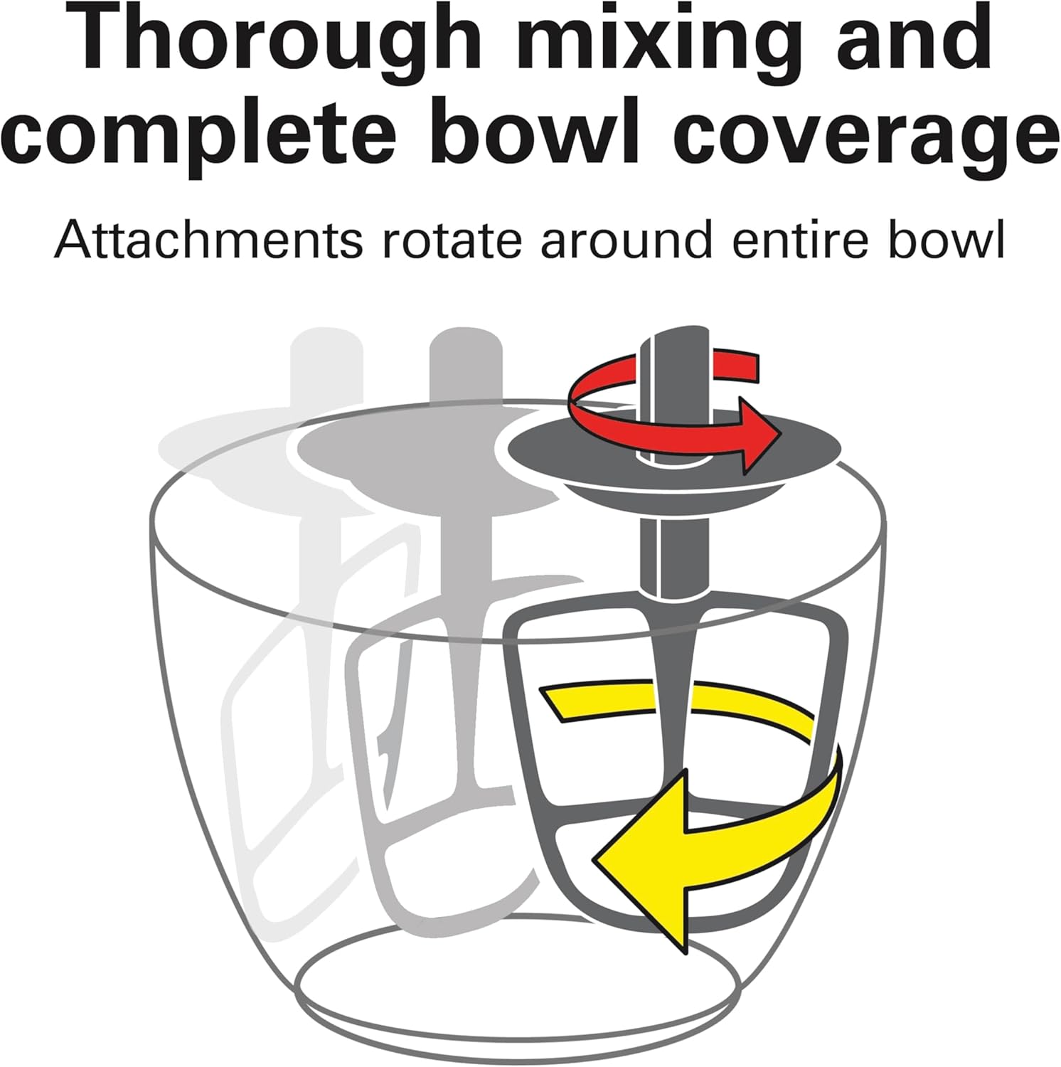 THOROUGH MIXING AND COMPLETE BOWL COVERAGE. As you mix, each stand mixer attachment rotates around the entire bowl as it spins at your selected speed. This planetary mixing action ensures that ingredients are mixed thoroughly and provides complete bowl coverage.