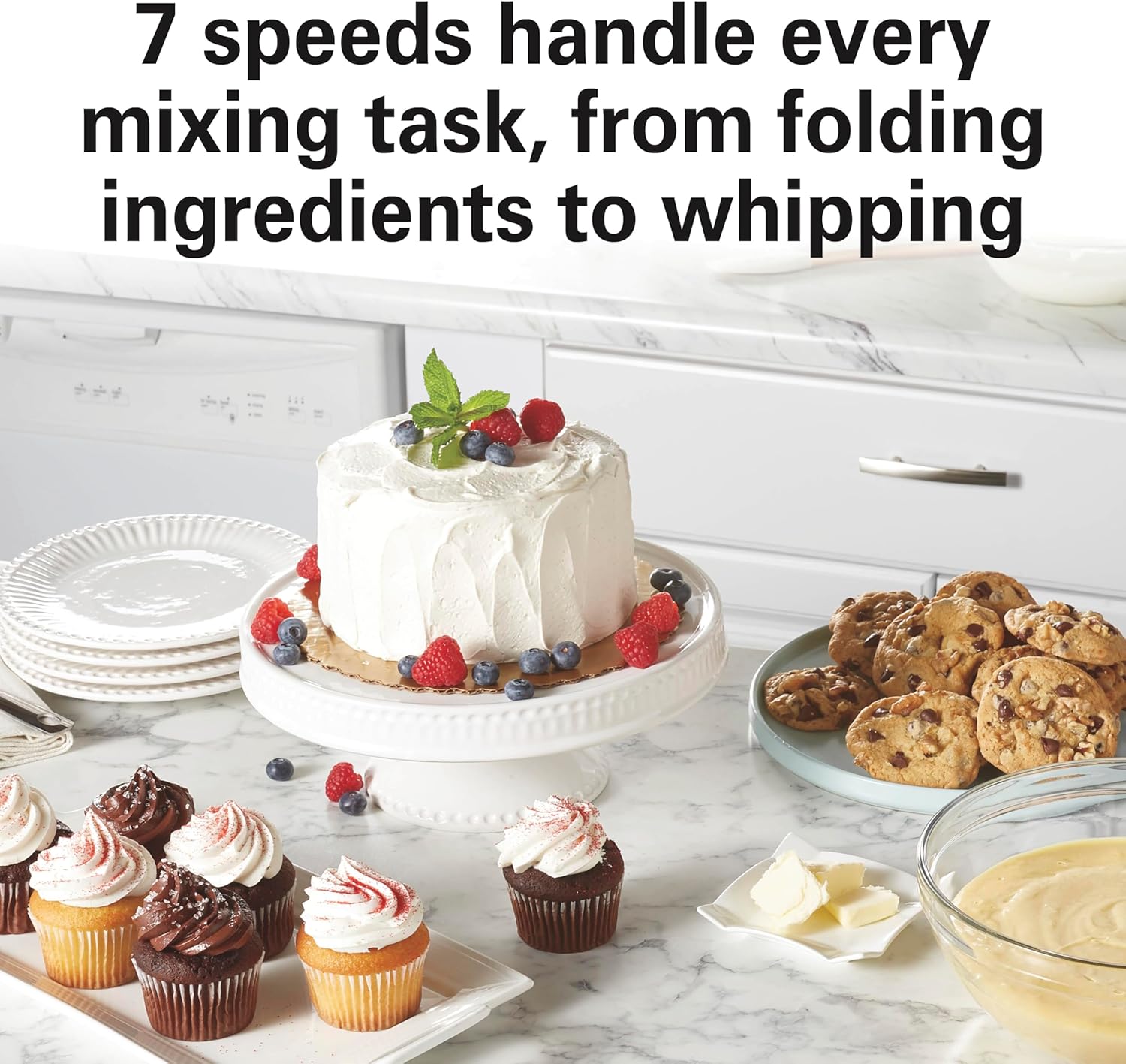 7 SPEEDS HANDLE EVERY MIXING TASK: Go from slowly folding and combining ingredients on the first speed all the way up to beating ingredients or whipping cream at top speed. The stand mixer’s wide range of 7 speeds will cover every mixing task.