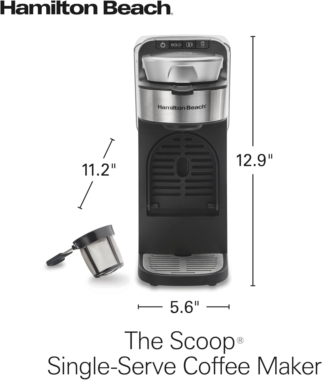 Hamilton Beach The Scoop Single Serve Coffee Maker & Fast Grounds Brewer for 8-14oz. Cups, Brews in Minutes, 40oz. Removable Reservoir, Stainless Steel (49987),Silver