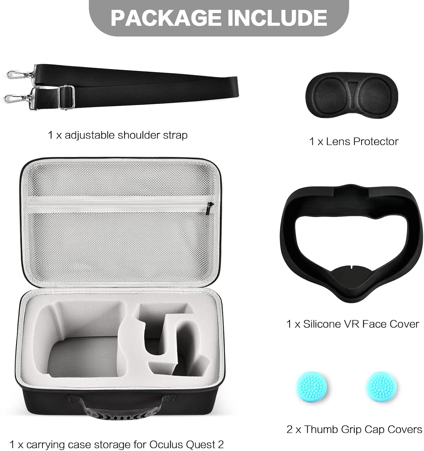 All in One Accessories Bundle for Quest 3 Headset: Travel hard storage bag for VR headset accessories kit, package include: 1 x carrying case storage for Quest 2/ Quest 3/ 3s, 1 x Silicone VR Face Cover, 1 x Lens Protector, 2 x Thumb Grip Cap Covers, 1 x adjustable shoulder strap, Meet all-round protection needs for VR headset.