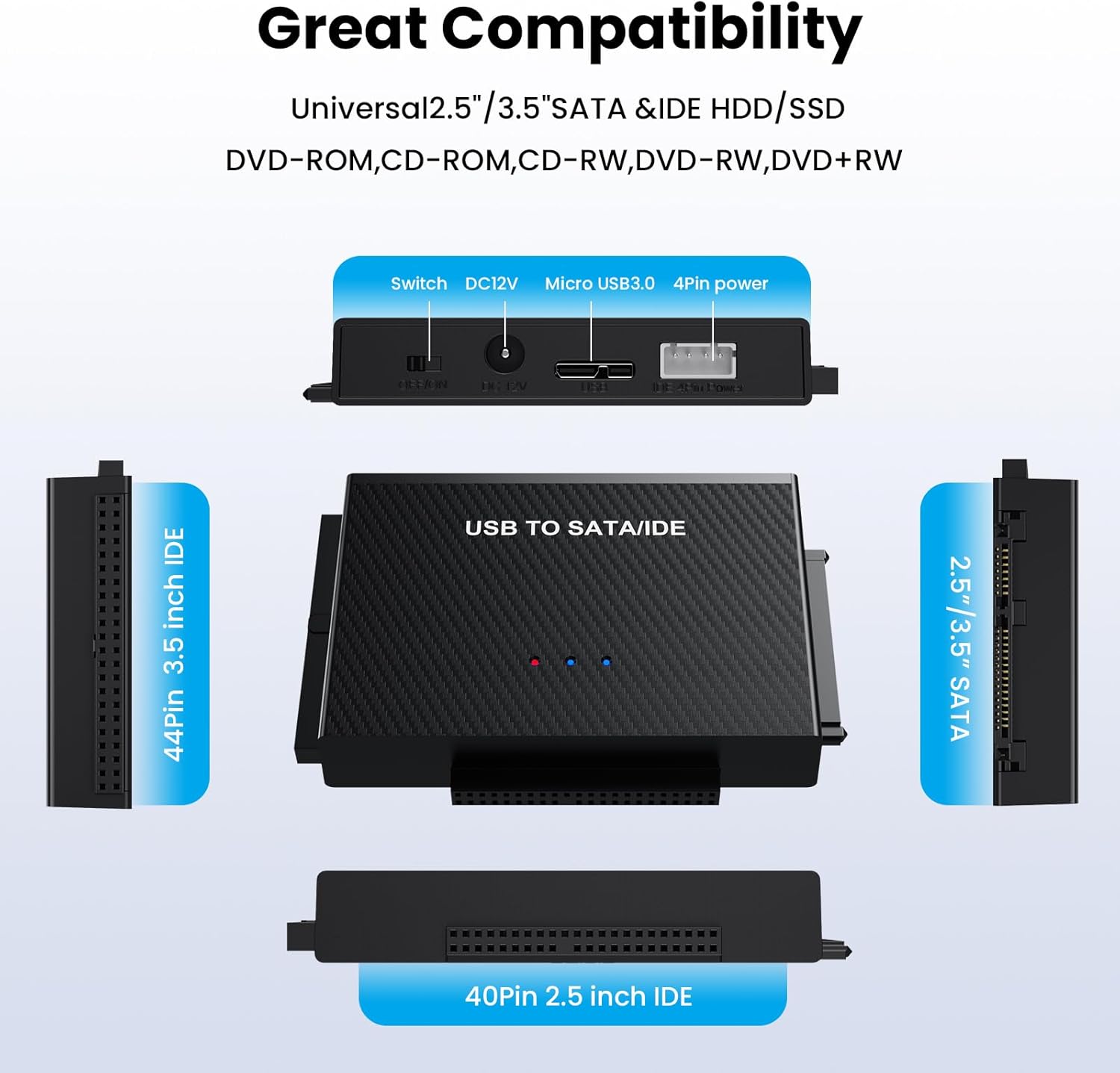 UNIVERSAL HARD DRIVE READER: SATA and IDE to USB 3.0 adapter supports 2.5″/3.5″ HDD/SSD, 2.5″/3.5″ IDE, 5.25″ DVD-ROM, CD-ROM, CD-RW, DVD-RW, DVD + RW optical drive. With dual-head IDE connector (40pin and 44pin) plus one SATA III connector, lt’s compatible with 2.5″/3.5″ DE/SATA hard drives