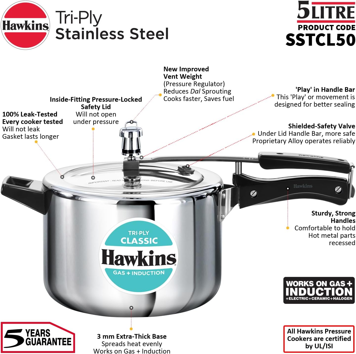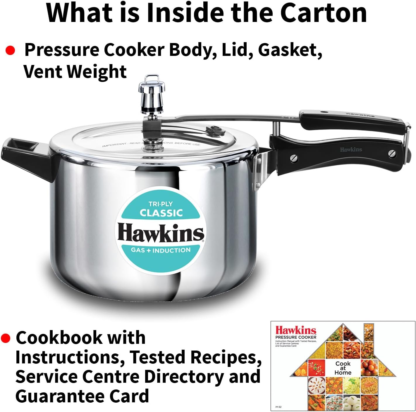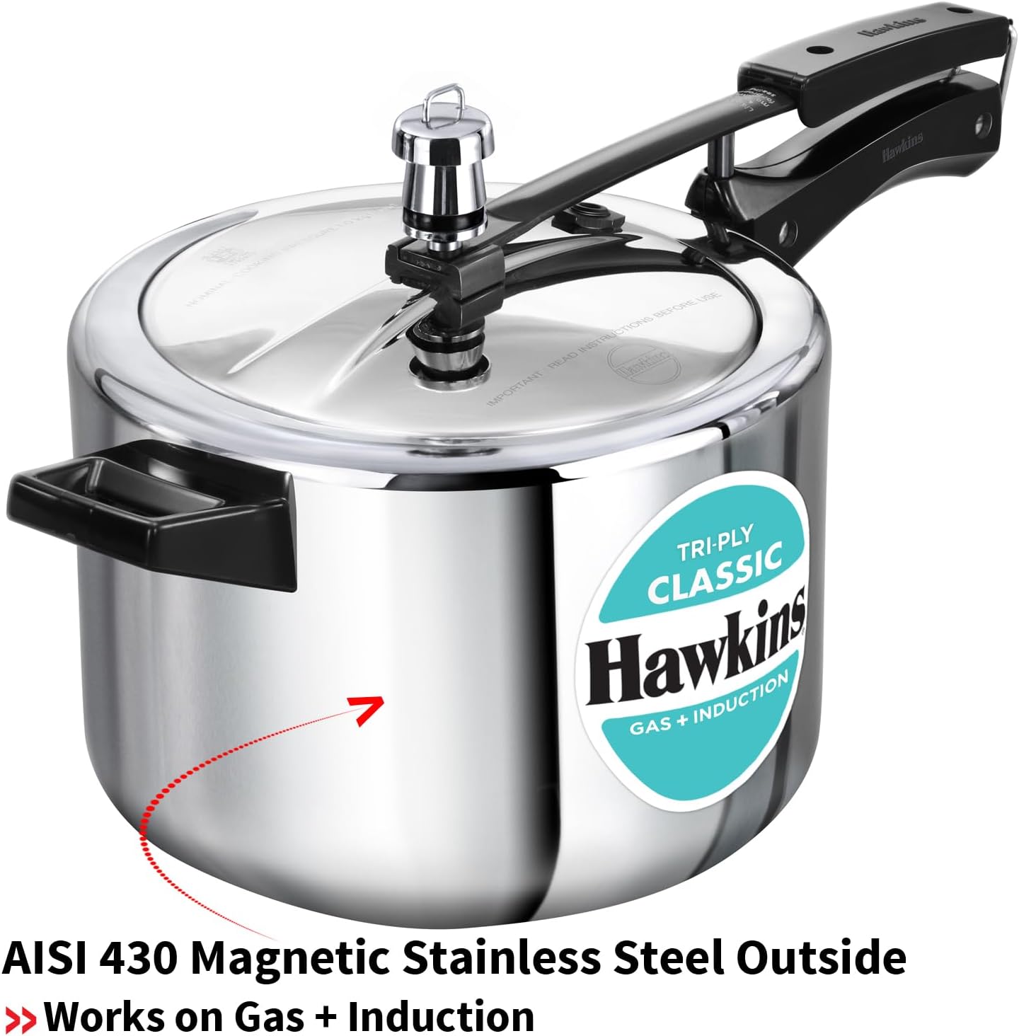 It is made of 3 mm extra-thick triply stainless steel, which provides durability and excellent heat distribution. The triply construction ensures that the pressure cooker uniformly heats the base and sides, preventing food and spices from burning or sticking. This feature also reduces the need for excessive oil while cooking. The pressure cooker features a wider mouth, allowing for easy stirring and better visibility of the food while cooking. It has an 18/8 superior food-grade stainless steel interior, ensuring strength, durability, and hygienic cooking conditions. The pressure cooker is equipped with a heavy gauge heat diffusing metal core, which spreads heat evenly through the base and up the sides. This ensures that your food cooks uniformly and efficiently. The pressure cookers exterior is made of AISI 430 magnetic stainless steel, making it compatible with both gas stoves and induction cooktops. It has sturdy, stay-cool plastic handles that are designed to be comfortable to hold, providing a secure grip and enhanced safety while handling the pressure cooker.