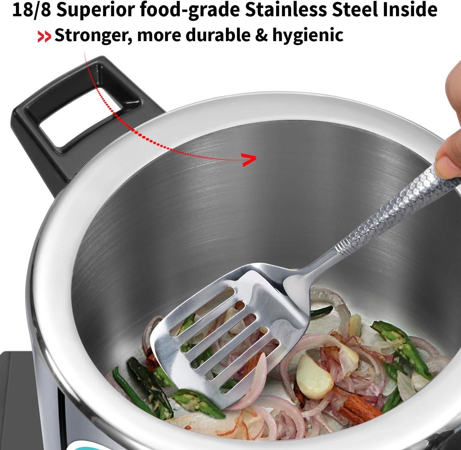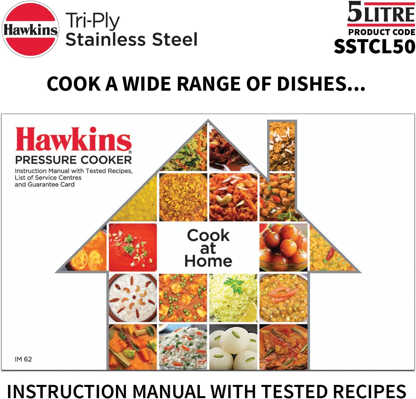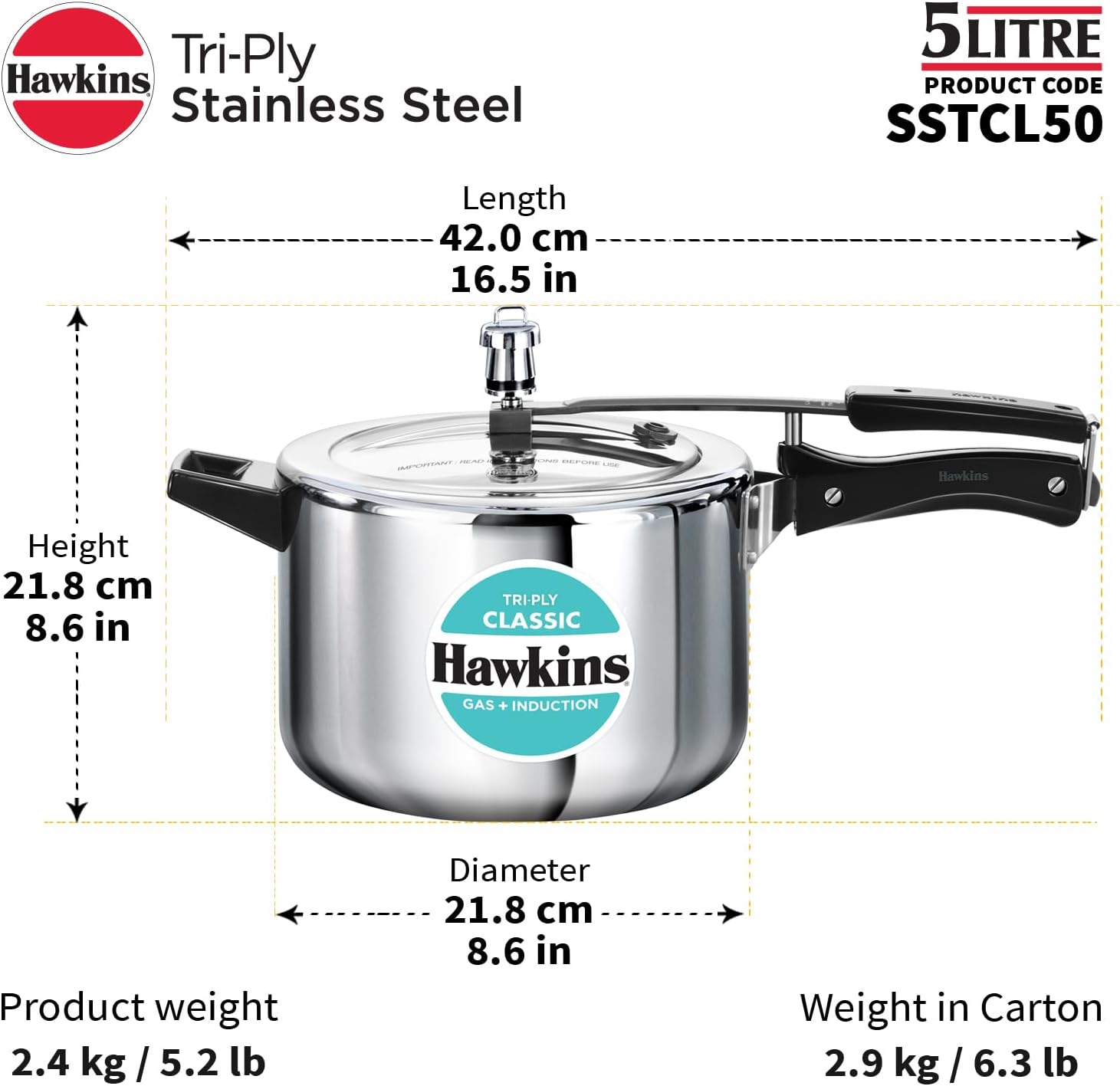 It is made of 3 mm extra-thick triply stainless steel, which provides durability and excellent heat distribution. The triply construction ensures that the pressure cooker uniformly heats the base and sides, preventing food and spices from burning or sticking. This feature also reduces the need for excessive oil while cooking. The pressure cooker features a wider mouth, allowing for easy stirring and better visibility of the food while cooking. It has an 18/8 superior food-grade stainless steel interior, ensuring strength, durability, and hygienic cooking conditions. The pressure cooker is equipped with a heavy gauge heat diffusing metal core, which spreads heat evenly through the base and up the sides. This ensures that your food cooks uniformly and efficiently. The pressure cookers exterior is made of AISI 430 magnetic stainless steel, making it compatible with both gas stoves and induction cooktops. It has sturdy, stay-cool plastic handles that are designed to be comfortable to hold, providing a secure grip and enhanced safety while handling the pressure cooker.