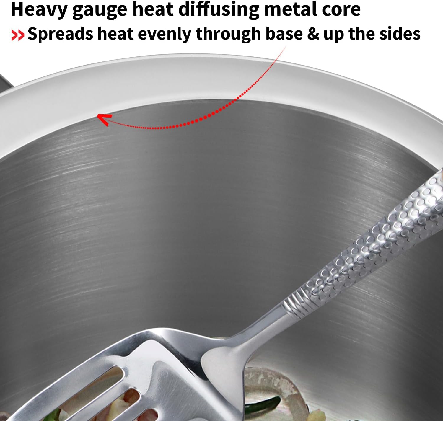 Heavy gauge heat diffusing metal core – Spreads heat evenly through base & up the sides for quick, even cooking