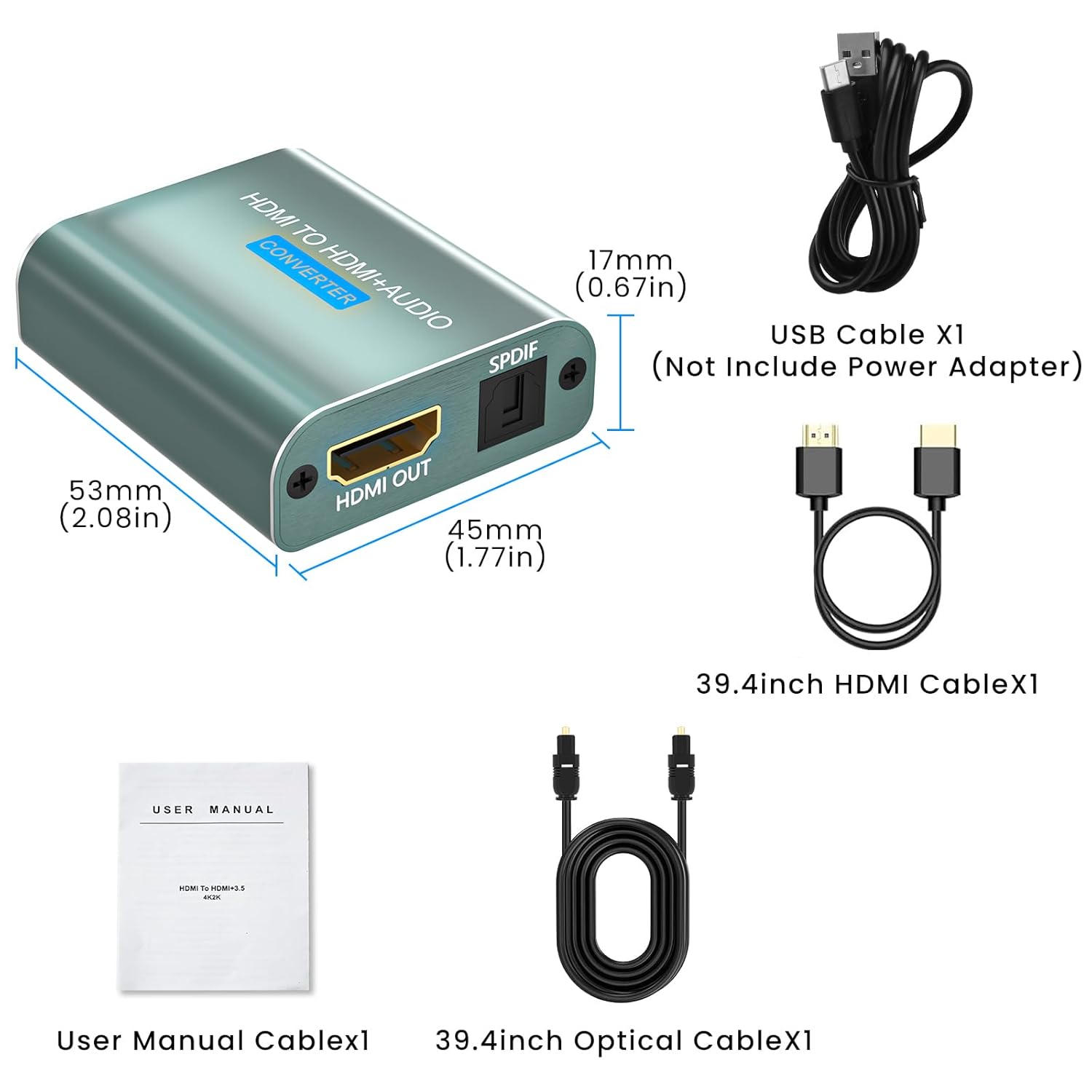 【Package Included】4K HDMI Audio Splitter x1, HDMI Cable x1, Optical Cable x, USB-C Charging Cablex1(Not Include Power Adapter), User Manual x1. If you have any questions during use, please contact us via the order number and we will always be there to help you.