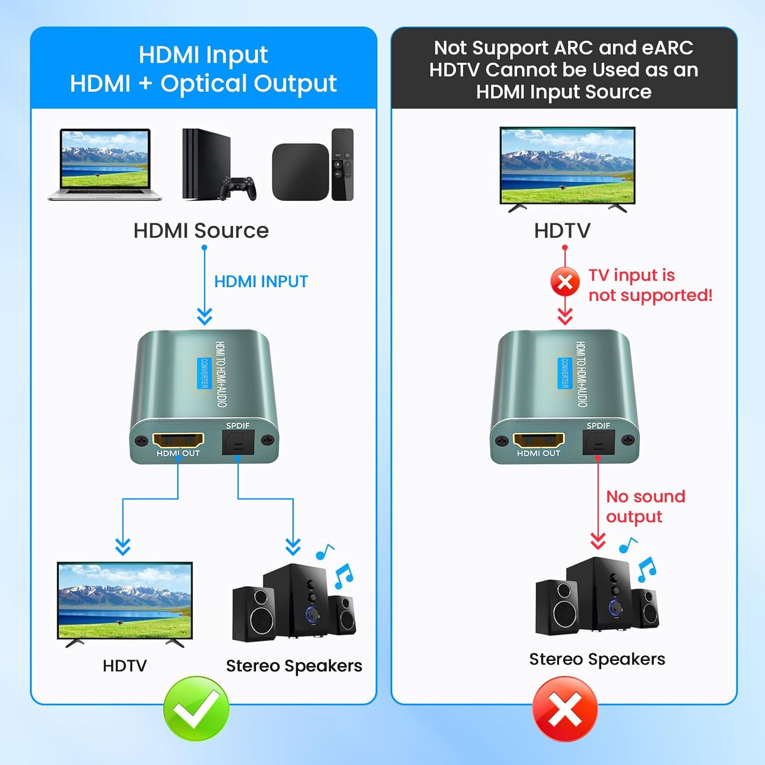 【HDMI Audio Splitter】Allows the HDMI input source to be connected to 4K HD display, extracts the digital audio signals via optical SPDIF interface to your soudbar or surround sound system.(Please Note That It Does 𝐍𝐨𝐭 𝐒𝐮𝐩𝐩𝐨𝐫𝐭 𝐀𝐑𝐂 𝐚𝐧𝐝 𝐞𝐀𝐑𝐂 Features.𝐇𝐃𝐓𝐕 𝐂𝐚𝐧𝐧𝐨𝐭 𝐛𝐞 𝐔𝐬𝐞𝐝 𝐚𝐬 𝐚𝐧 𝐇𝐃𝐌𝐈 𝐈𝐧𝐩𝐮𝐭 𝐒𝐨𝐮𝐫𝐜𝐞 & HDMI output does not support audio devices).
