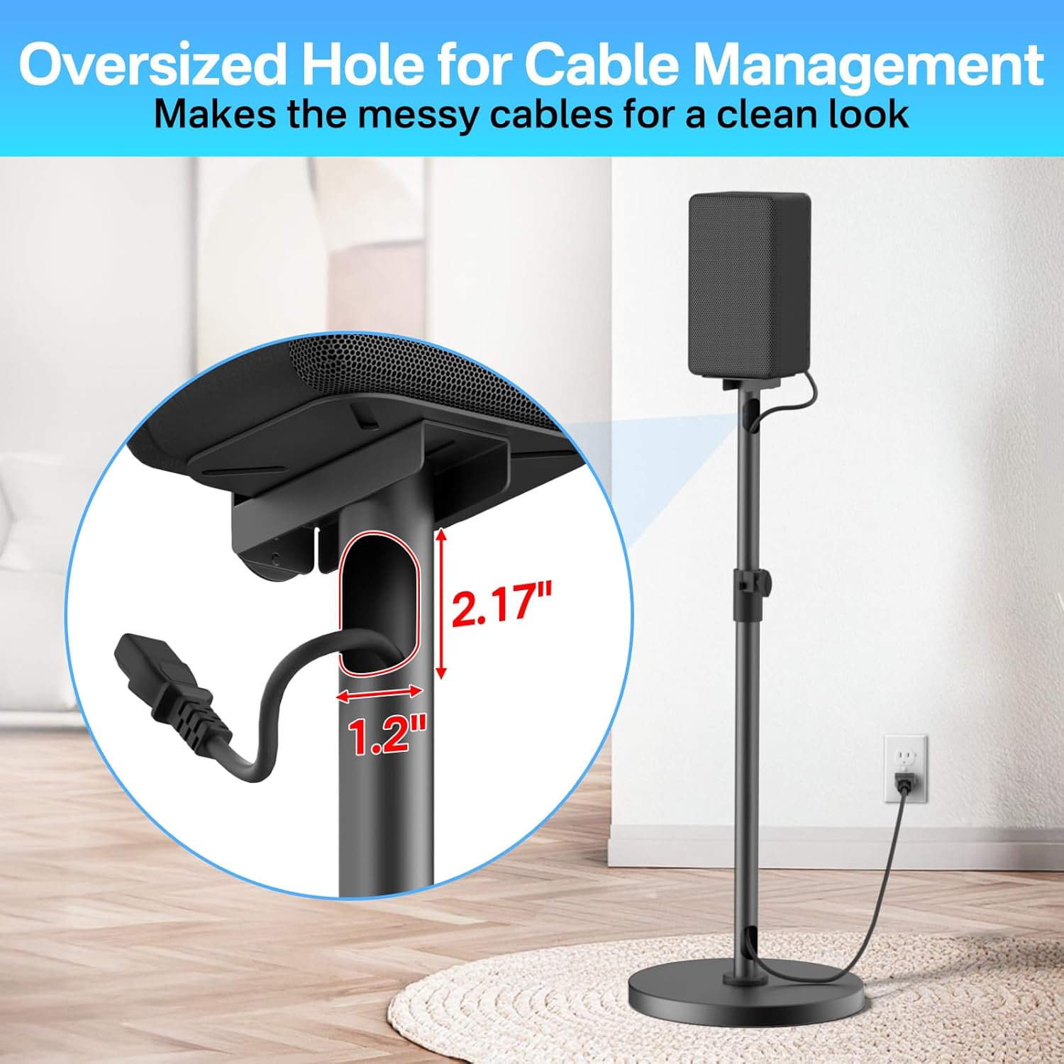 Cable Management – The speaker stands for Sony rear speaker stands with large holes (2.17″ H x 1.2″ W) to efficiently manage and conceal cables for a tidy and organized setup.