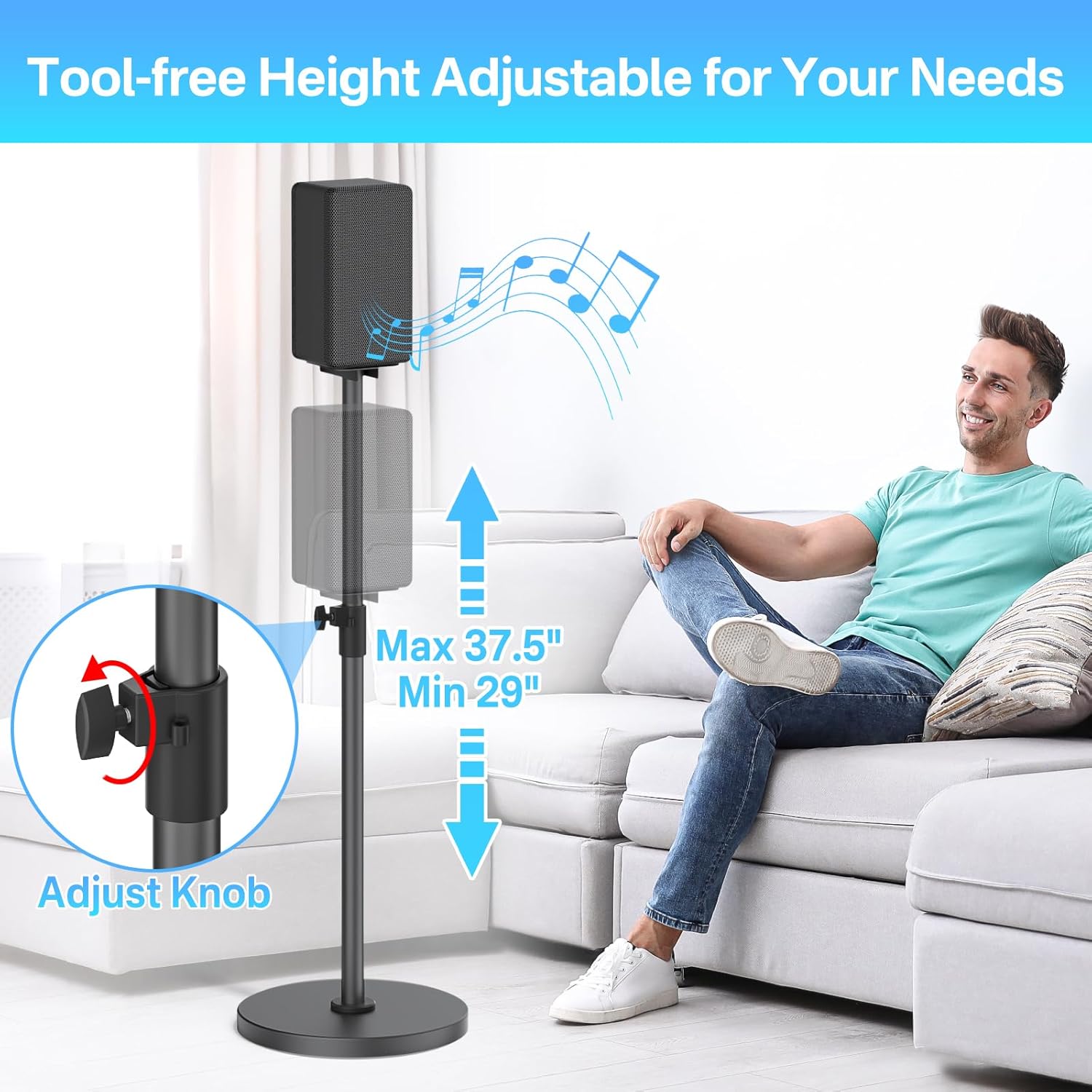 Tool-free Height Adjustment – The extendable tube of the speaker stands for Sony surround sound stands adjustable from 29″ to 37.5″, the easy-to-use knob makes height changes a breeze without additional tools, placing the heavy duty surround sound speaker stands for Sony on the appropriate ear-level height can also reduce reflections to give you more clear sound experience.