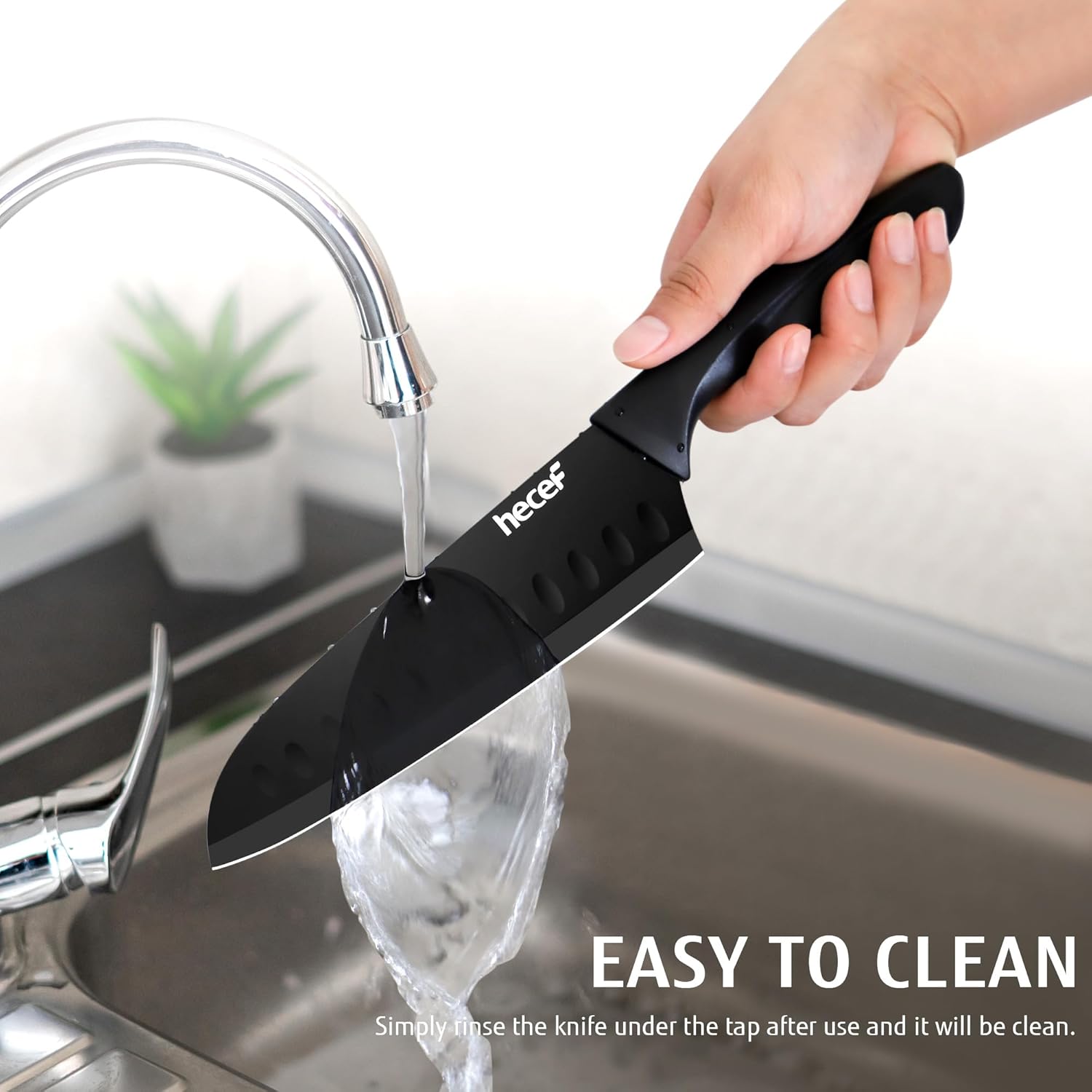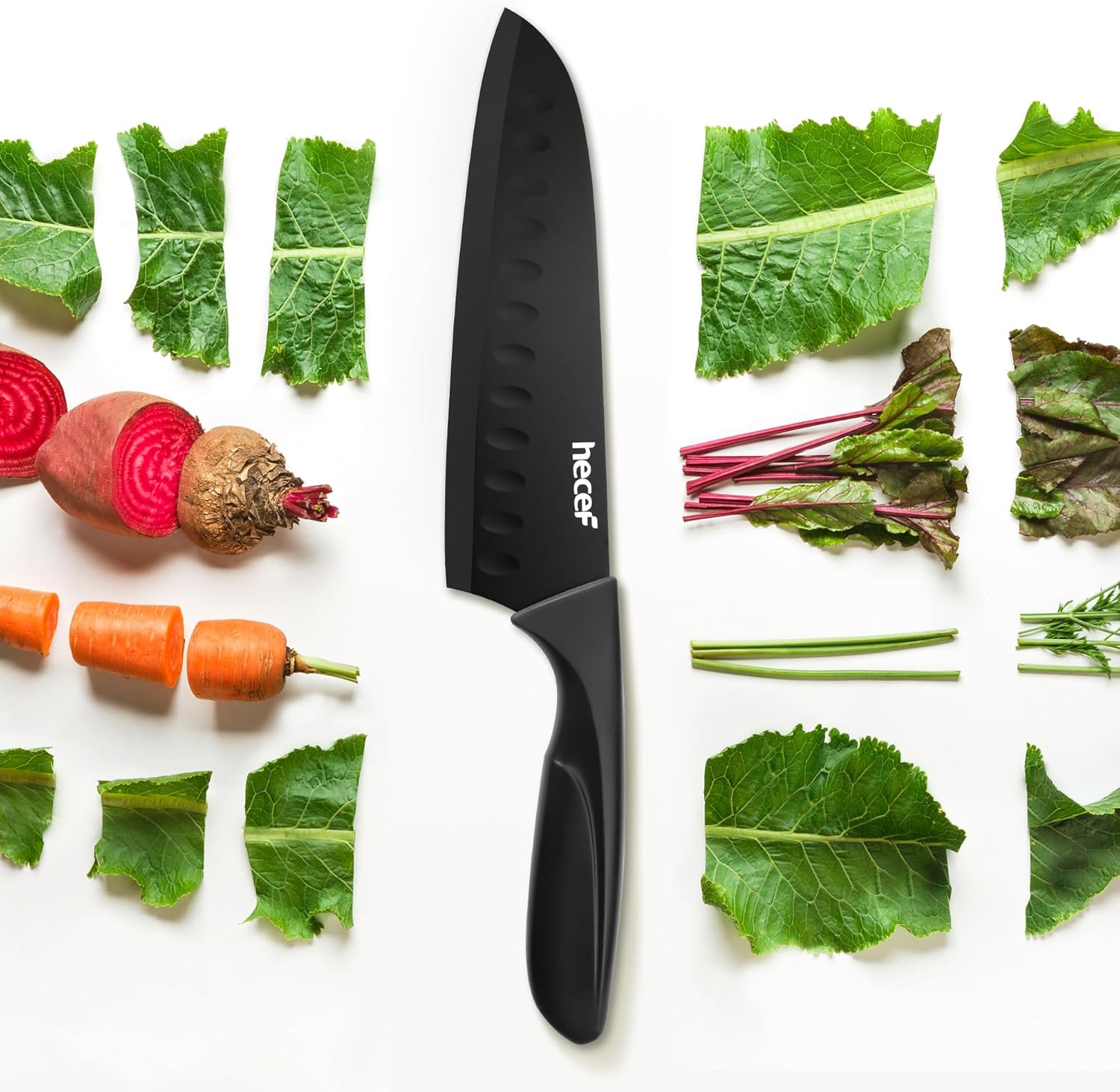 Multi-purpose Knife Set of 3: This set includes Santoku Knife, Utility Knife an Paring Knife, which is designed for everyday use. The Santoku knife combines features of both chef knife and cleaver, which is made for slicing, dicing and mincing. And, the utility knife and paring knife has smaller and versatile blade for detailed works, which help to make every meal a work of art.