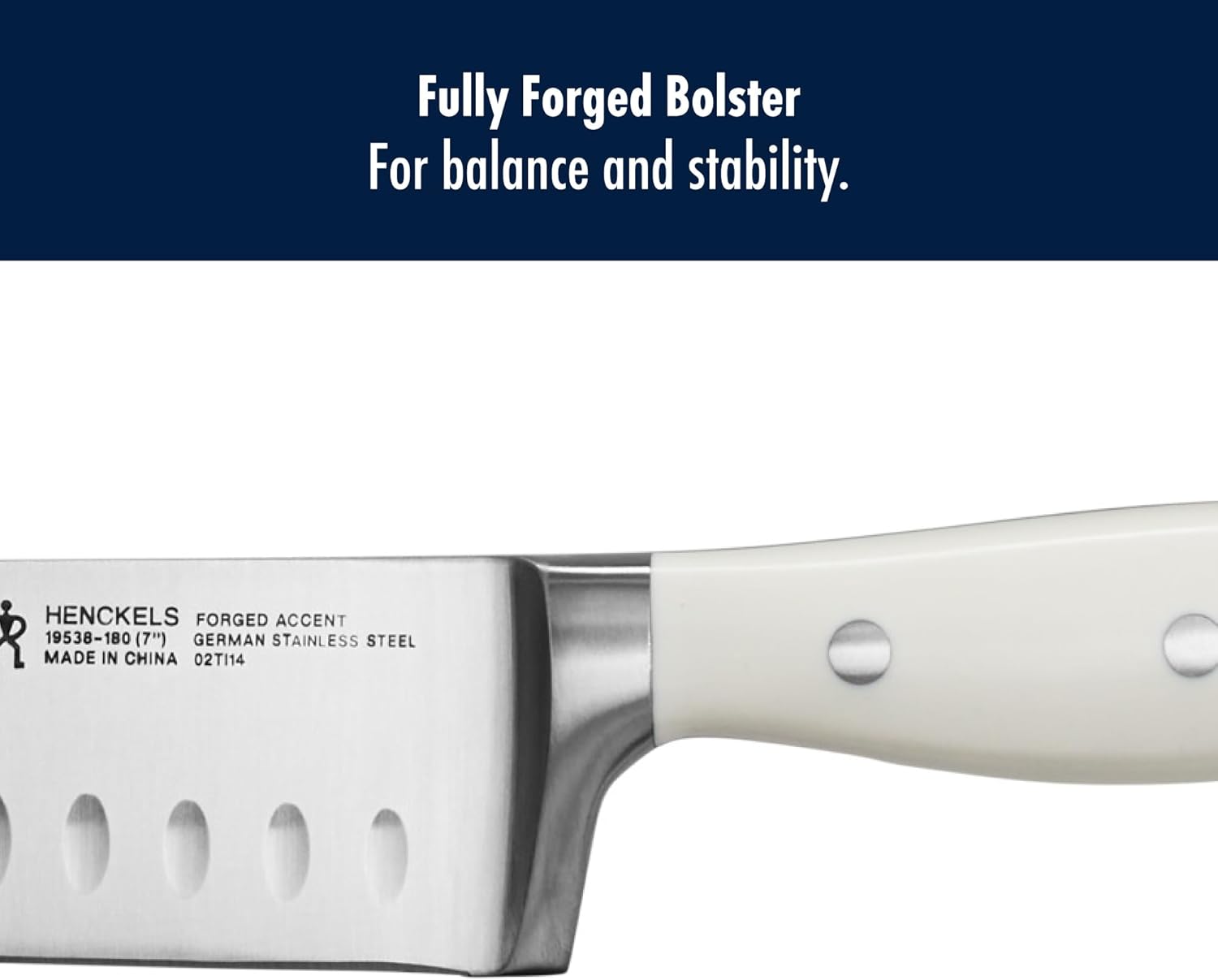 Enjoy High Performance With This Elegant Knife LineThis sophisticated line from HENCKELS marries superior cutting with an elegant profile. Enjoy the best results while beautifying your kitchen. With a stylish curved triple-rivet handle featuring an attractive endcap, these knives will be a welcome addition to your kitchen countertops.Forged Accent knives are fabricated from high-quality German stainless steel, perfect for precision cutting. The forged bolster construction seamlessly transitions from blade to handle for durability and balance. Curved for comfort, the triple-rivet handle features a stylish, stainless-steel endcap that adds aesthetic appeal to your knife block. Stamped with the single man HENCKELS logo, this Halberdier symbolizes Forged Accent’s superb quality at a remarkable value