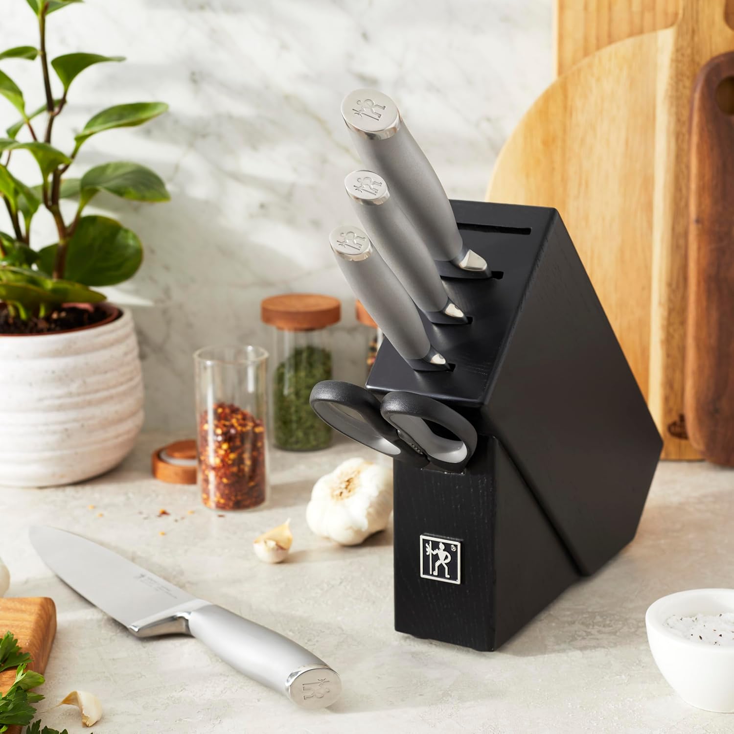 VERSATILITY: The Henckels International Modernist 6-piece Knife Block Set is stocked with tools to easily tackle every kitchen task. The black colored hardwood block features 5-slots for some of the best tools in the kitchen trade: a 3” paring knife, 5” serrated utility knife, 6” utility knife, 8” chef’s knife, and kitchen shears. For your convenience, these tools are dishwasher safe.