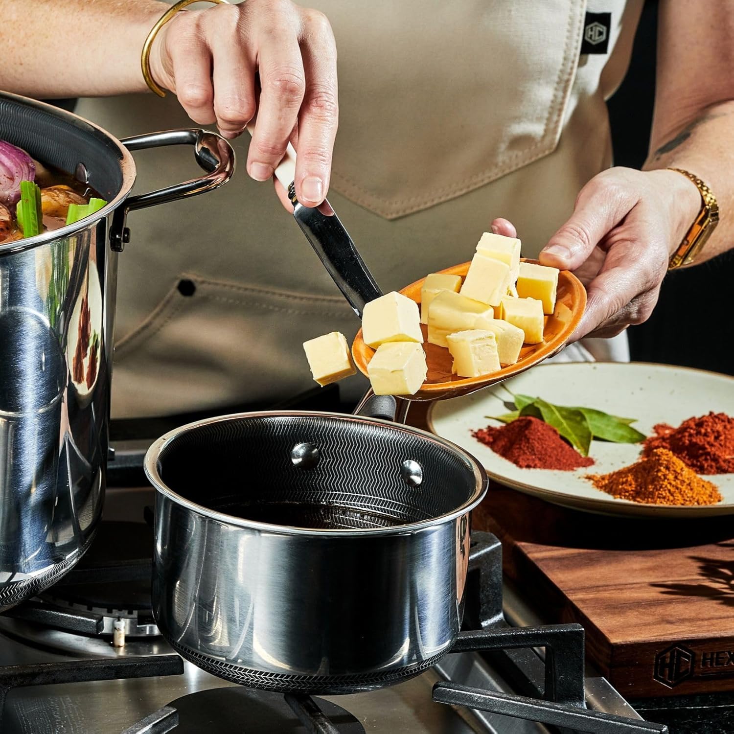 Tri-ply construction with an aluminum core for quicker even heating, it’s safe to use on any home cooktop or stovetop, including induction. HexClad is metal utensil-safe, dishwasher-friendly, and oven-safe up to 900°F. (Tempered glass lids are oven-safe up to 400°F, while stainless steel lids are oven-safe up to 900°F.)