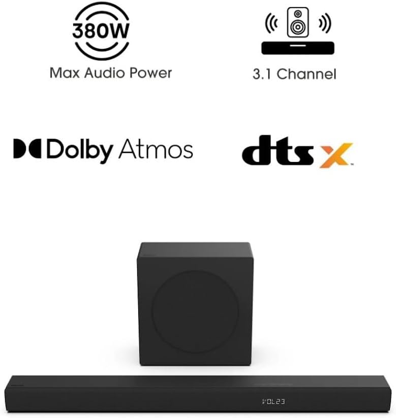 Upgrade your audio experience with the Hisense R632 3.1 channel soundbar and wireless subwoofer. The R632’s 380 watts of sound fills the room with a 5-speaker array that also projects sound overhead, making the most of Dolby Atmos, creating an immersive, surround sound experience. 7 audio enhancement modes, including news, movie, sports, game, and night modes, optimize sound specifically to the content or time of day. And eARC provides a simple one-cable connection with the included HDMI cable. Bluetooth audio makes it easy to connect your phone, tablet or laptop wireless to enjoy music and more.