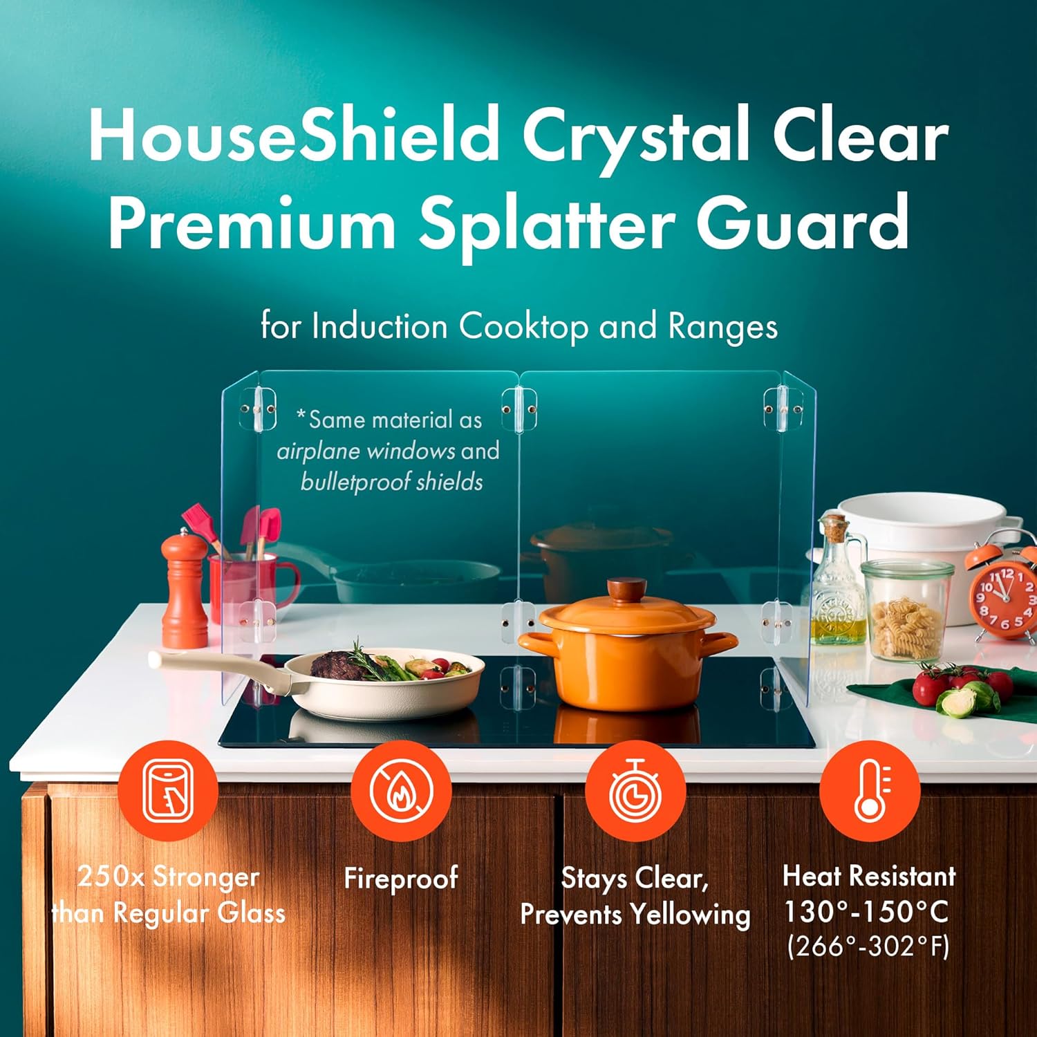 SUPERIOR DURABILITY: Made from tough polycarbonate, HouseShield Transparent Splatter Guard is impact-resistant, heat-resistant up to 302°F (150°C), and more durable than regular glass or acrylic, ensuring long-lasting performance.