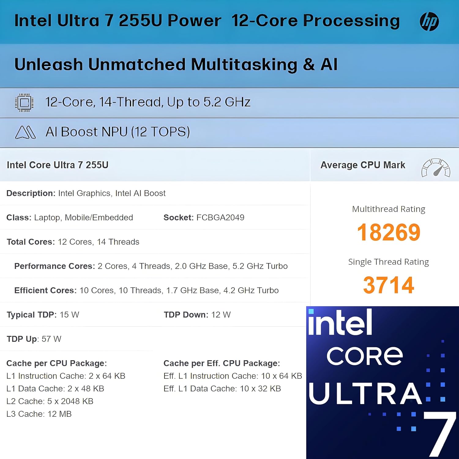 Intel Core Ultra 7 255U, 12C (2P + 8E + 2LPE) / 14T, Max Turbo up to 5.2GHz, 12MB