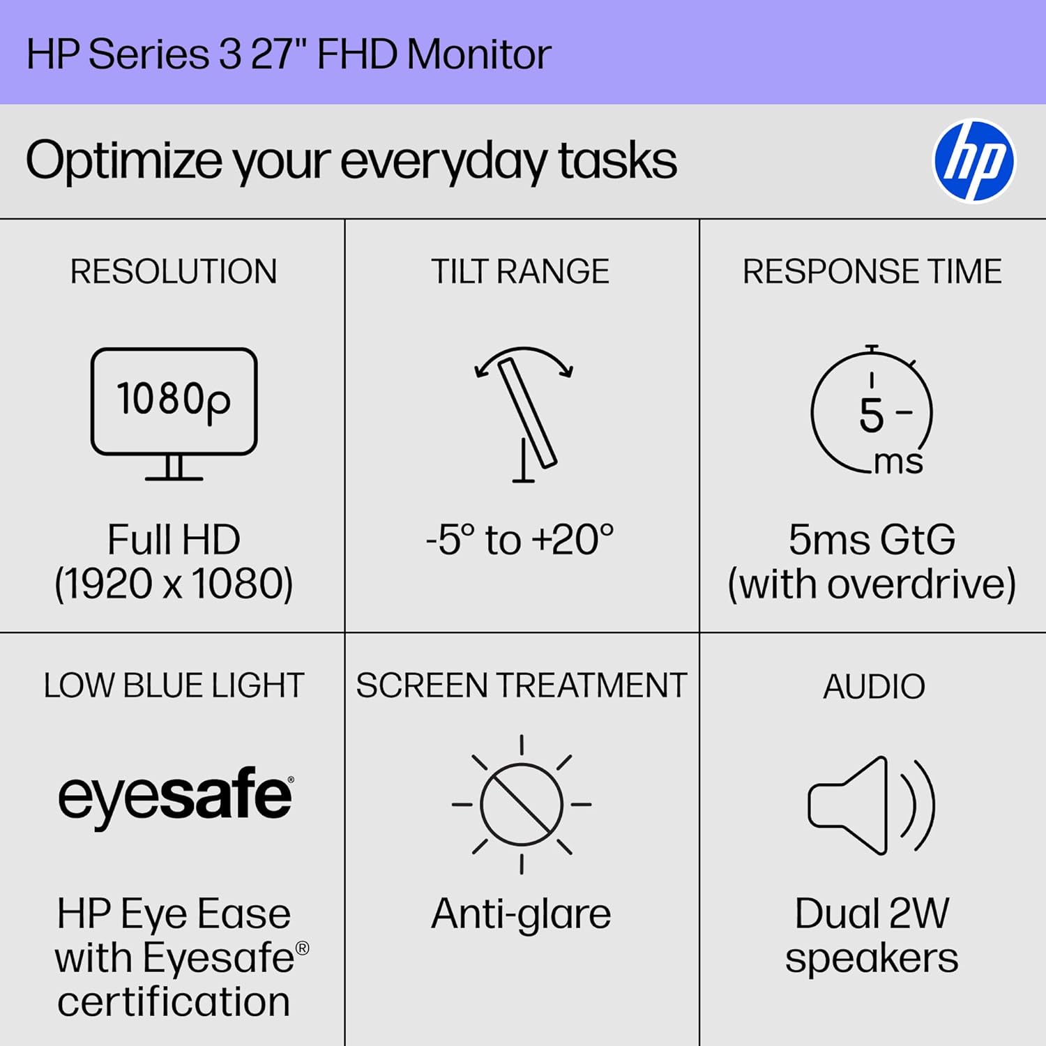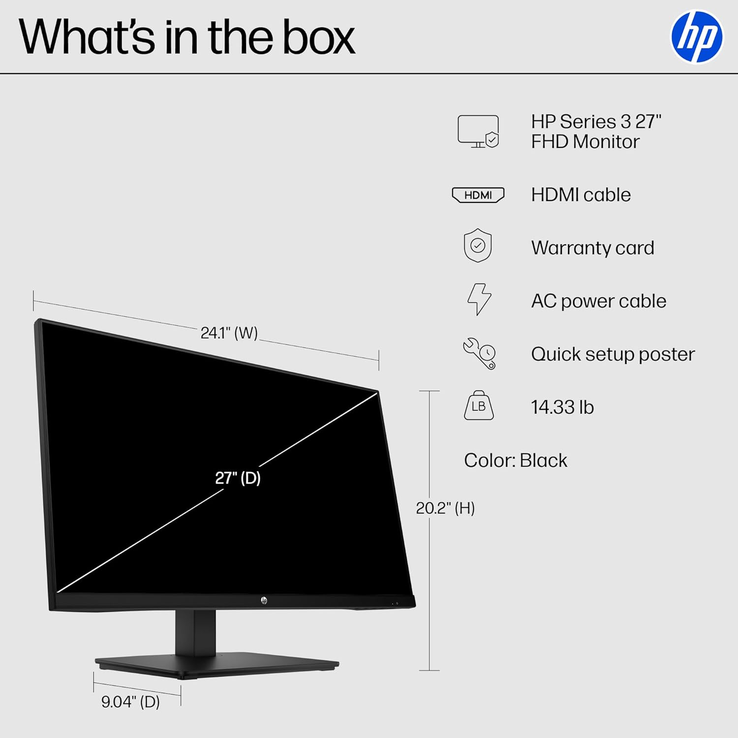 HP Series 3 27 inch FHD Monitor: Optimize your everyday tasks. Make the most out of your day on this spacious 27-inch FHD, energy-efficient monitor. Boost productivity with just the right visual features while also experiencing great comfort with a screen that you can adjust to your ideal position. Streamline your desk with a monitor that helps you stay focused. Cut the clutter with neat cable management, and a 3-sided borderless design to cleanly pair dual monitors. Plus, two 2W speakers built in for a better audio experience. This HP monitor comes with a HDMI cable, warranty card, AC power cable, and quick setup poster. HP is here to help. This HP monitor comes with HP 3-year limited warranty.