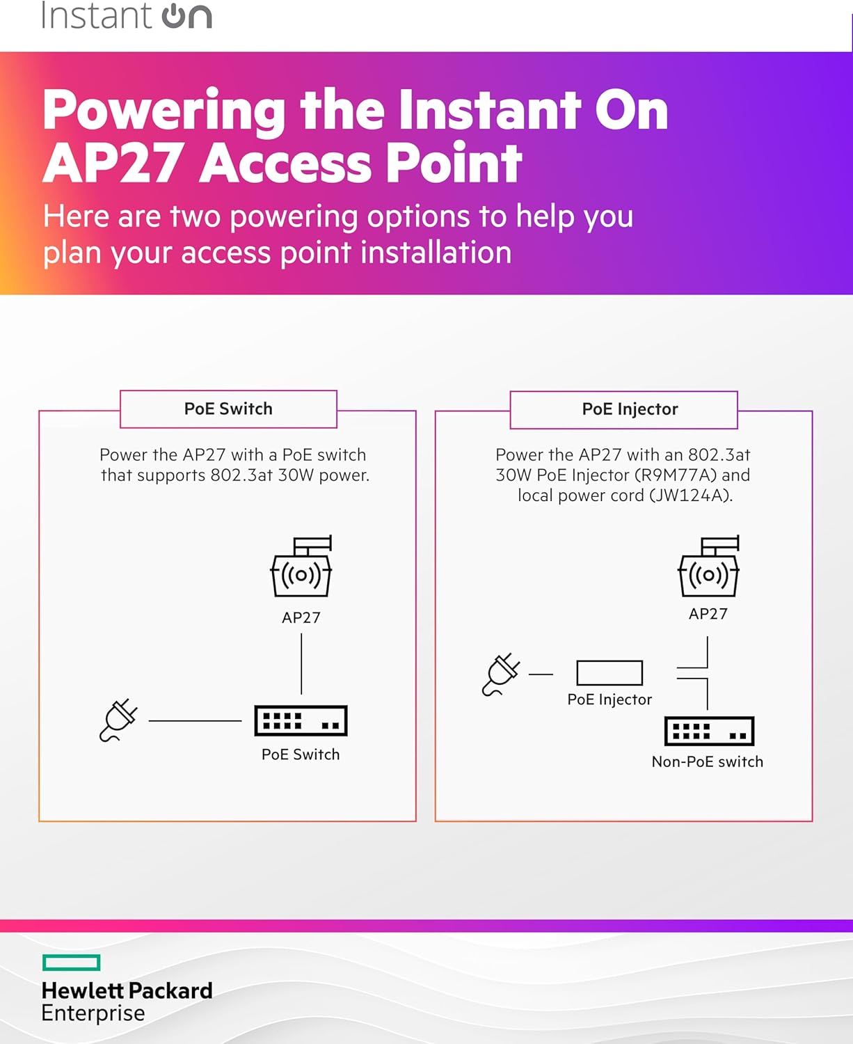 POWERING: The Instant On AP27 can be powered with Power over Ethernet (PoE) 802.3at Class 4 only. This model (S1T36A) provides only the unit, no power source included. For powering, use either a 802.3at 30W PoE Injector (R9M77A) or a PoE switch that supports 802.3at 30W PoE power. The Instant On switch series can all power this access point