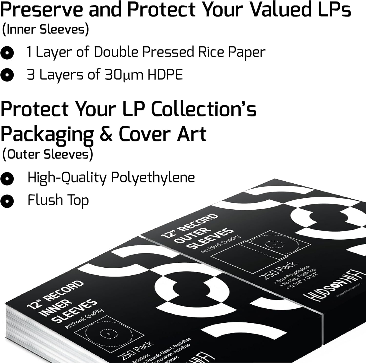 Hudson Hi-Fi Anti-Static Vinyl Record 250 Inner 250 Outer Sleeves – Ultimate LP Protection from Scratches, Dust & Dirt- Acid Free Thick Rice Paper