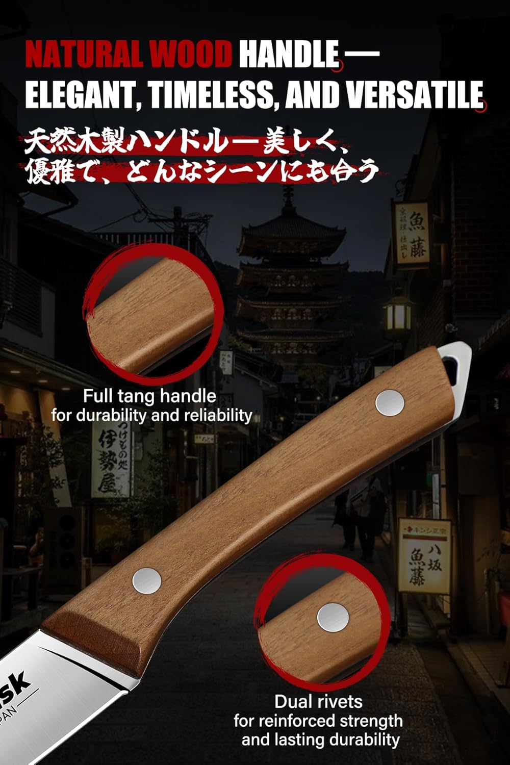 Full Tang Wooden Handle: Natural wood handles provide a warm, elegant feel in the hand, while the full tang construction enhances stability and control, ensuring both strength and comfort during dining or cooking preparations