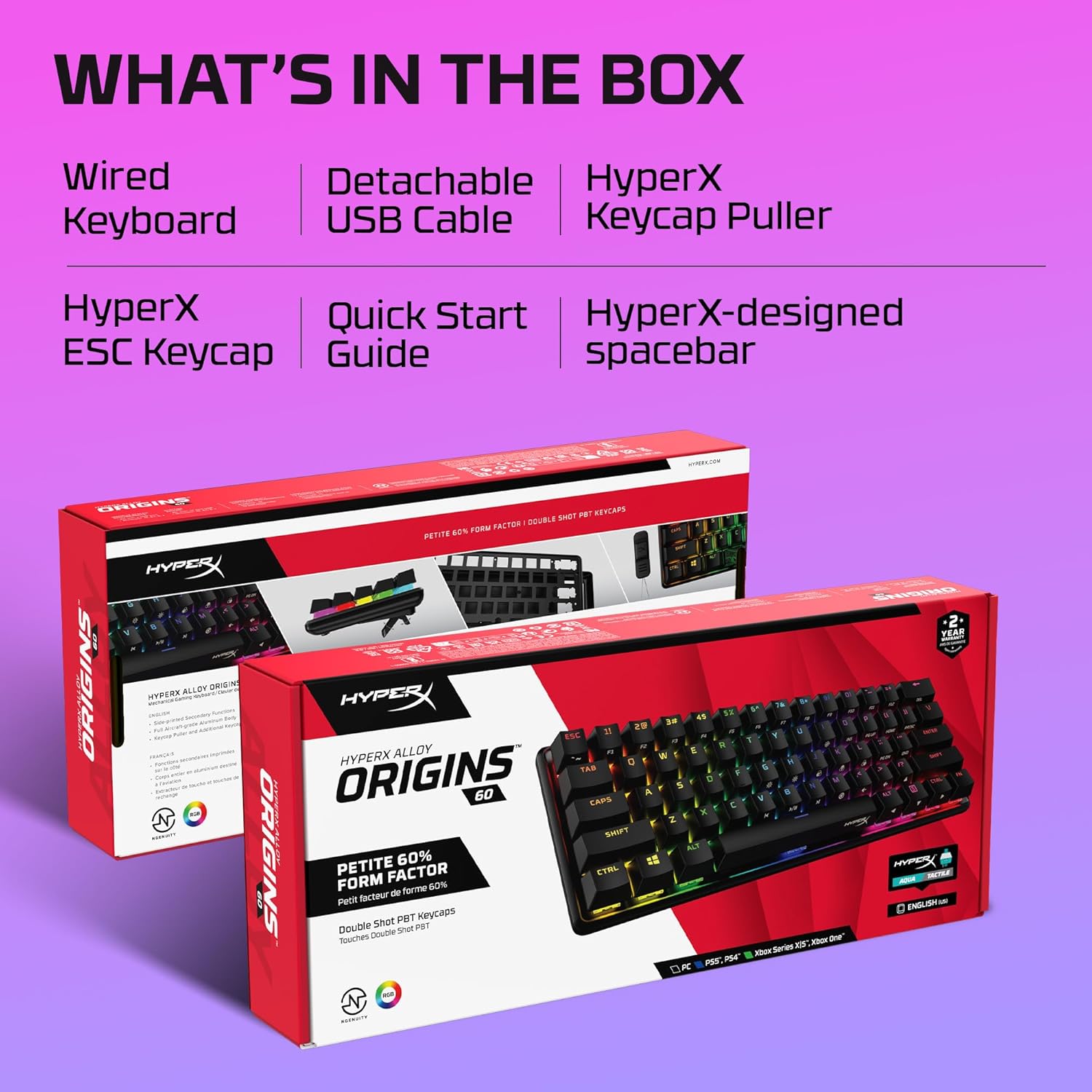 The HyperX Alloy Origins 60 is a durable, supremely portable 60% form factor keyboard that provides more room for sweeping mouse movements. It features a durable, full aluminum body, and reliable HyperX switches balanced for speed and performance. The pre-installed double shot PBT keycaps have secondary functions printed on them so you can quickly locate any additional functionality you need. Further customize your keyboard with macros, lighting effects, and more with HyperX NGENUITY software.