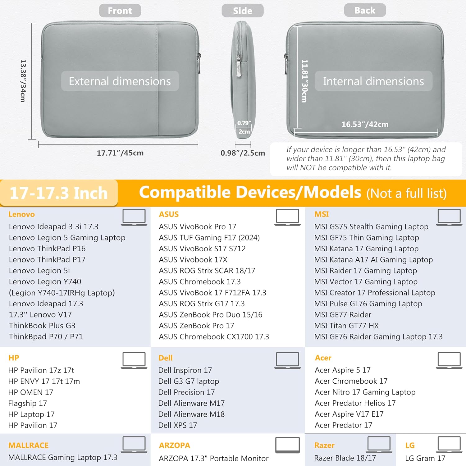 Internal Dimensions: 16.53″ x 11.81″ x 0.79″. Compatible with HP Laptop 17, HP Pavilion/ENVY/OMEN/Flagship 17, ASUS VivoBook (Pro) 17, ASUS ChromeBook 17.3, ASUS ZenBook Pro 17, ASUS ROG Strix Scar 17, ASUS TUF Gaming F17, Dell Inspiron/Precision/XPS 17, Lenovo Ideapad 3 3i 17.3, Lenovo ThinkPad P17, Lenovo Legion 17.3, Acer Chromebook/Nitro/Aspire 5 17, Acer Predator (Helios) 17, MSI Gaming Laptop 17, Razer Blade 17/18, MALLRACE Gaming Laptop 17.3, LG Gram 17, etc.