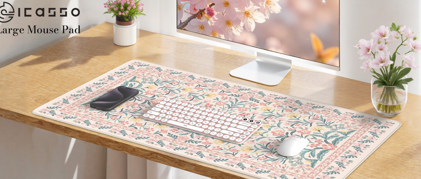 iCasso Mouse Pad,Large Pink Desk Mat Set, 4in1 XXL Mousepad + Keyboard Wrist Rest+Mouse Wrist Rest+Coaster with Ergonomic Desk Pad for Home Office Table Computer Cover -Pink Stay Positive