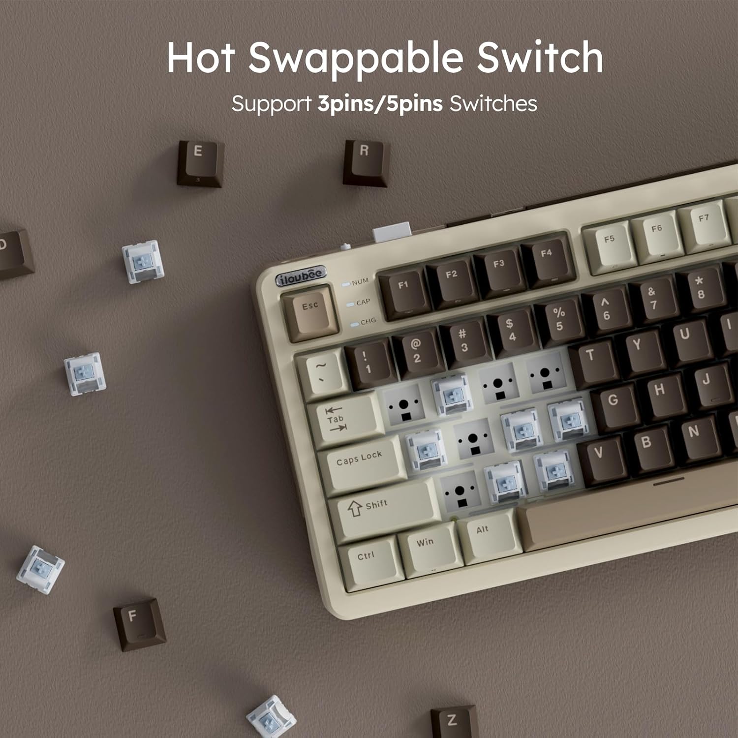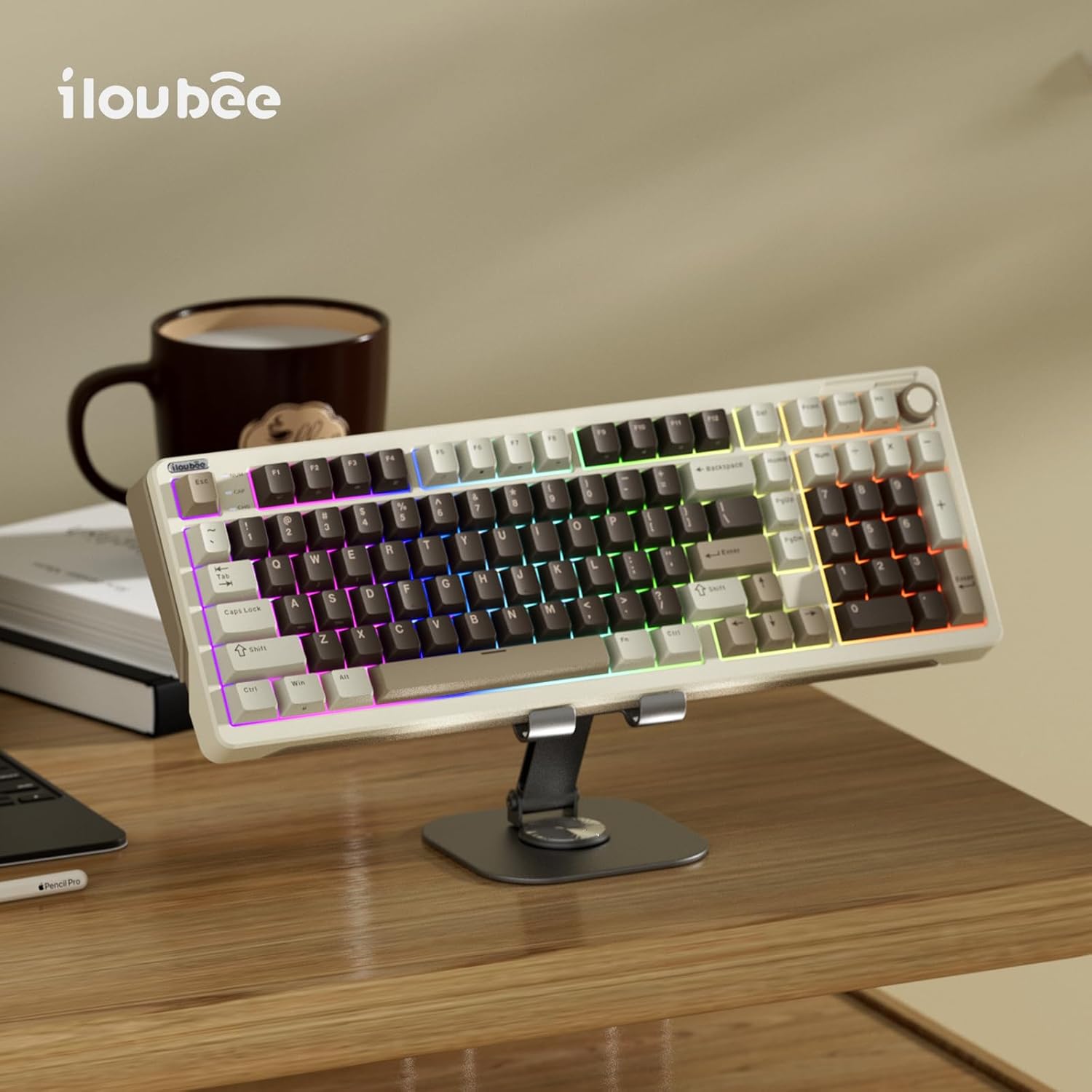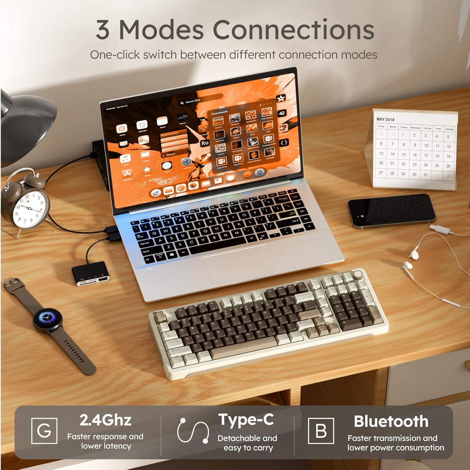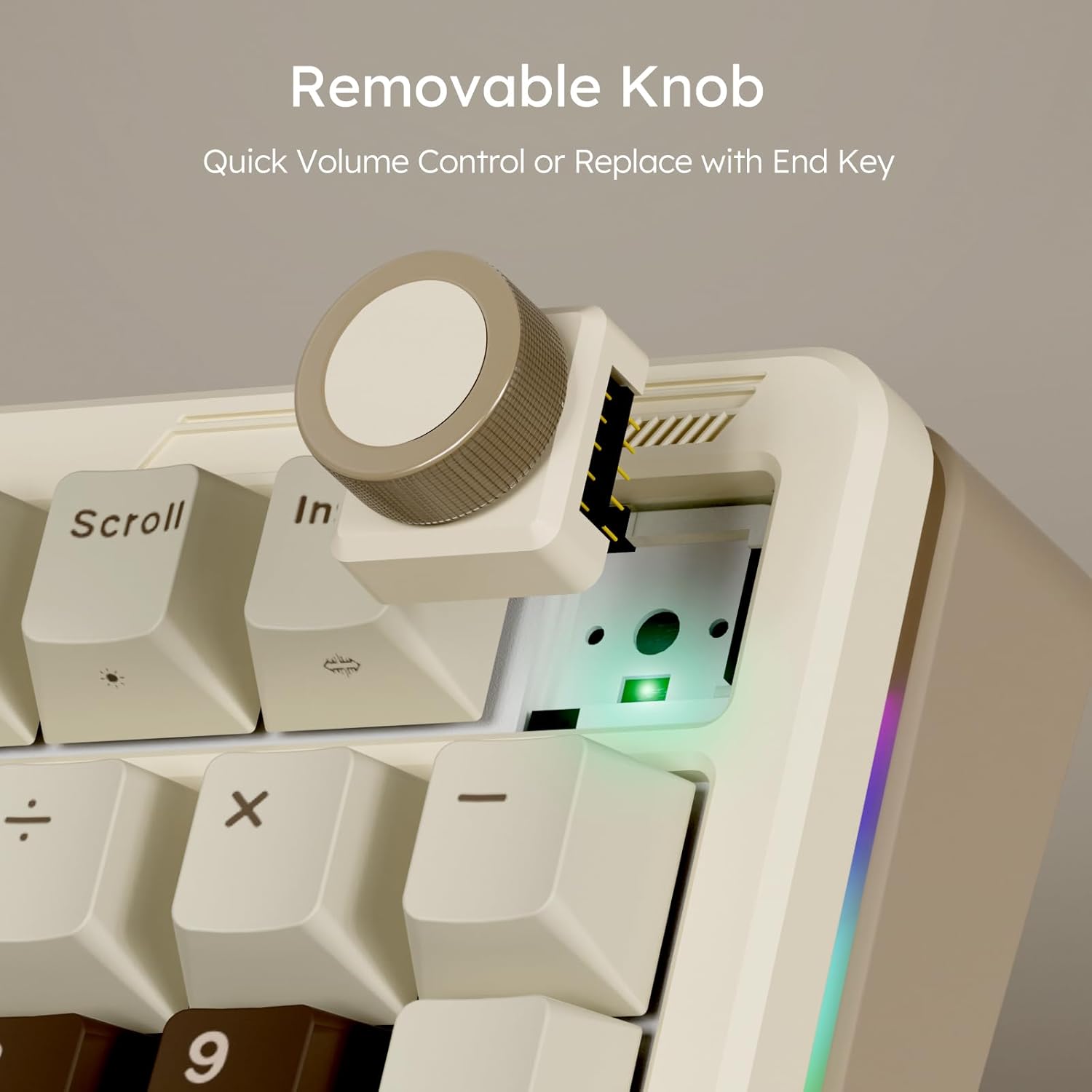 Full Size Keyboard with Volume Knob – The wireless mechanical keyboard features a 98% layout with number pad, function keys, and a volume knob. The knob allows easy volume control and can be swapped with the End key for customization. Perfect for those seeking full-sized functionality with limited desk space