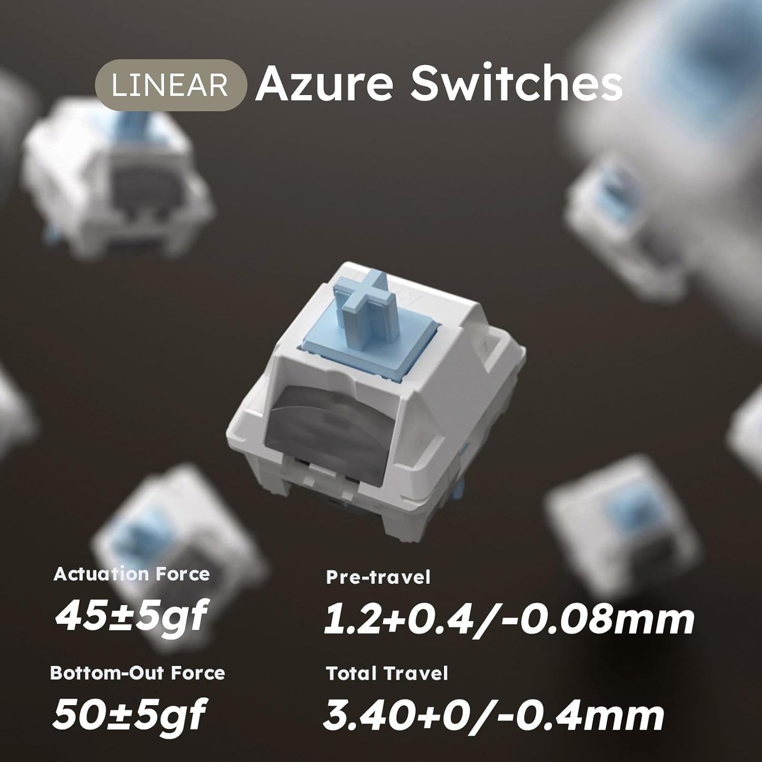 Hot Swappable Linear Switches – Experience smooth, responsive typing with Azure switches featuring 1.2mm short trigger travel. The hot swappable board lets you easily swap between 3-pin/5-pin mechanical switches without soldering, perfect for building your PC gaming keyboards