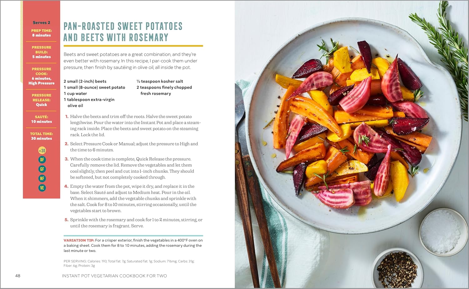Tips on cooking for two―Get smart suggestions for planning meals, stocking your kitchen, and shopping for groceries in small batches.Instant Pot guidance―Learn everything your Instant Pot can do, find answers to frequently asked questions, and get pointers for safe and successful cooking.A focus on nutrition―Find nutritional information for every recipe in this Instant Pot vegetarian cookbook, plus tips for adapting dishes to be vegan, gluten-free, and more.