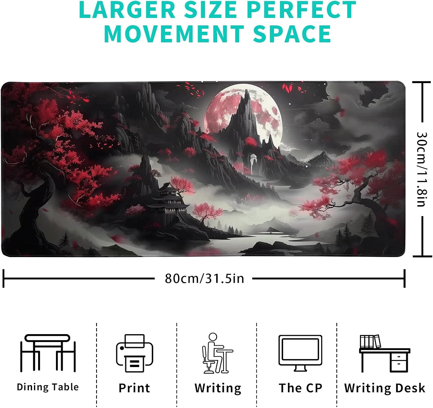 Japanese Desk Mat Red Full Moon Desk Pad Black Riverside Large Mouse Pad Gaming Mousepad Extended XL Keyboard Pad 31.5 x 11.8 in Laptop Computer Mouse Keyboard Mat for Office Desk Decor