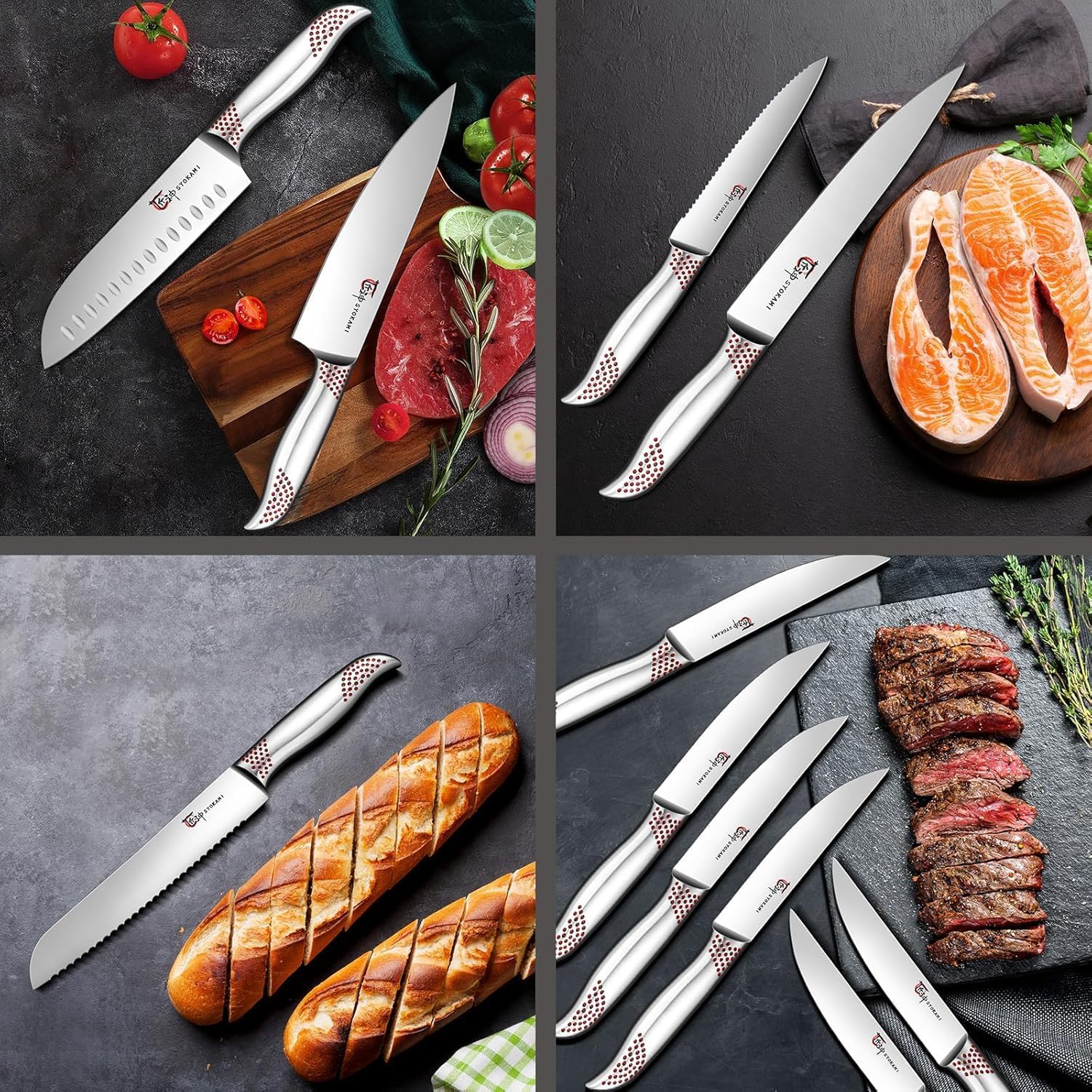 COMFORTABLE & NON-SLIP HANDLE: The ergonomic knife handle contour design is comfortable to hold, and the hand will not feel any discomfort even after long-term use. Unique stainless steel molded dimpled handle, provides secure grip and perfect balance. With a anti-slip design, you can cut and slice confidently, all while keeping your hands strain-free