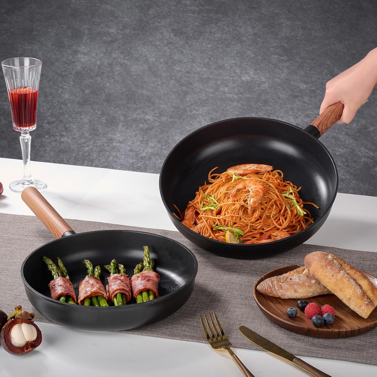 [Ceramic surface] The pots and pans set features a ceramic non-stick coating, effectively resists food residue and stains. Enjoy effortless food non-stick cooking experience, with non-toxic for safety. The smooth surface makes cleanup quick and easy—often just a simple wipe leaves it spotless, saving you time and effort.