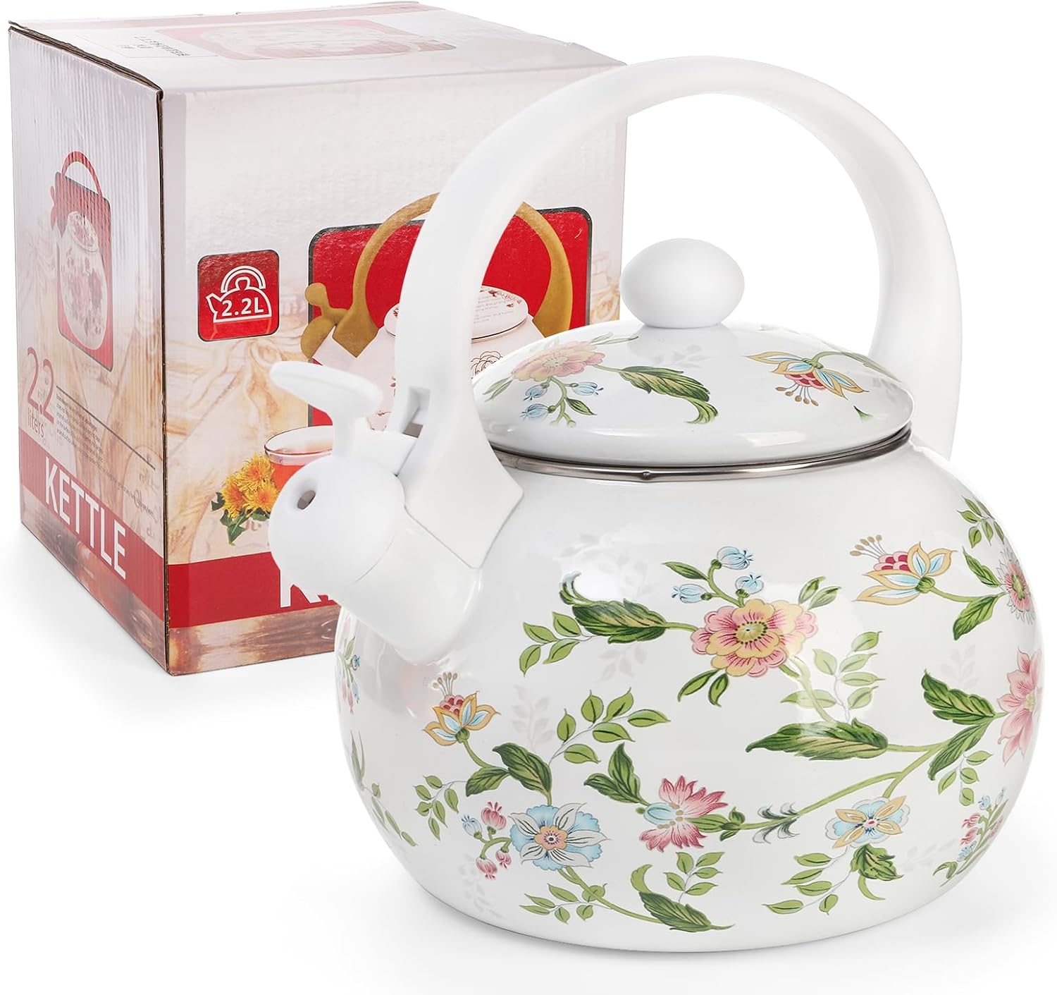 Jucoan 2.3 Quart Vintage Enamel Tea Kettle, Floral Enamel on Steel Teakettle Water Kettle for Home Kitchen