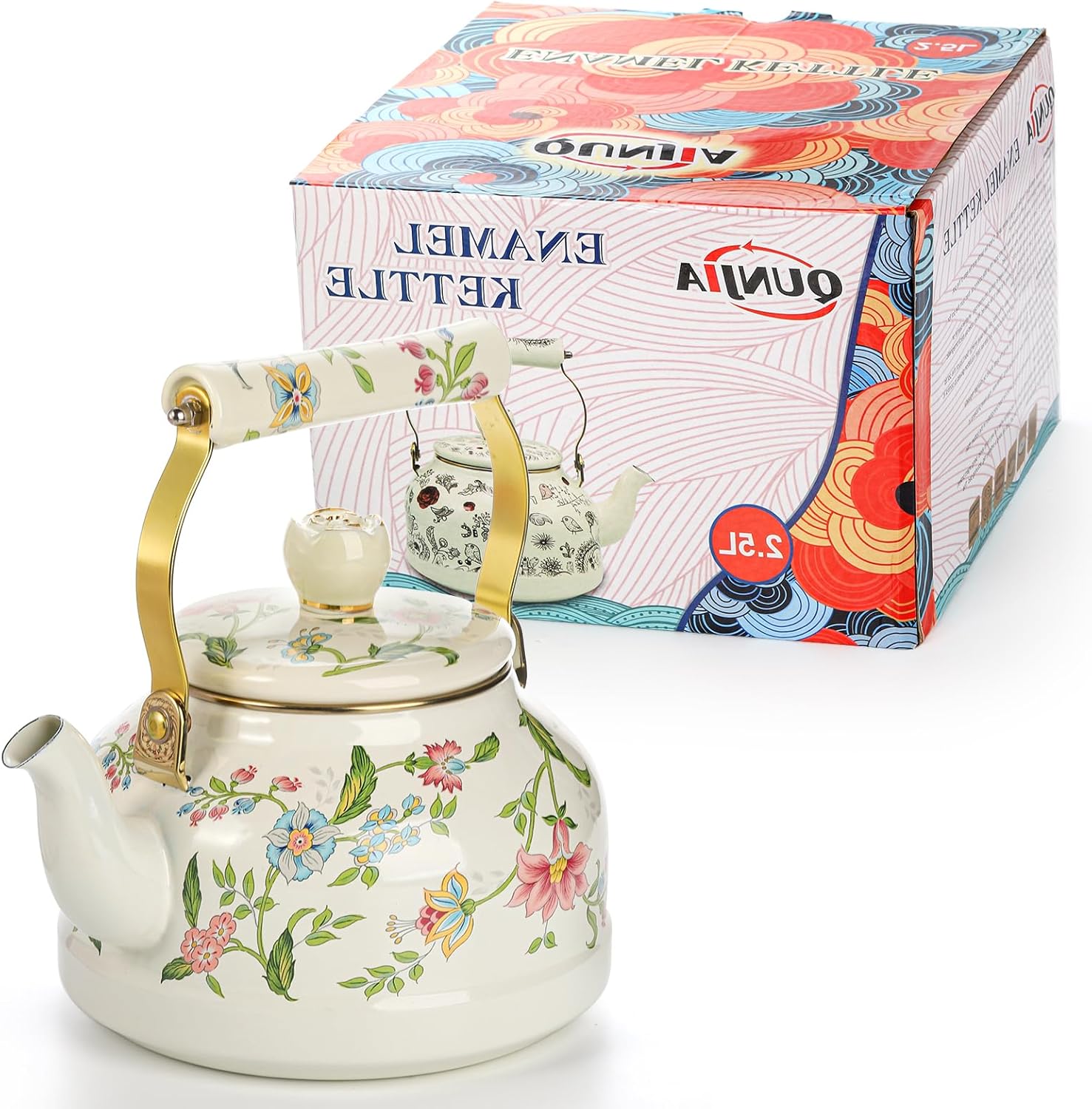 Retro Enamel Tea Kettle: Our upgraded enamel tea kettle is made of thicken 0.8mm steel enameled with high quality porcelain glaze at 800 degree high temperature creating a smooth, glossy finish, sturdy and resistance to corrosion, fast heat conductivity, healthy durable cookware for long time use.