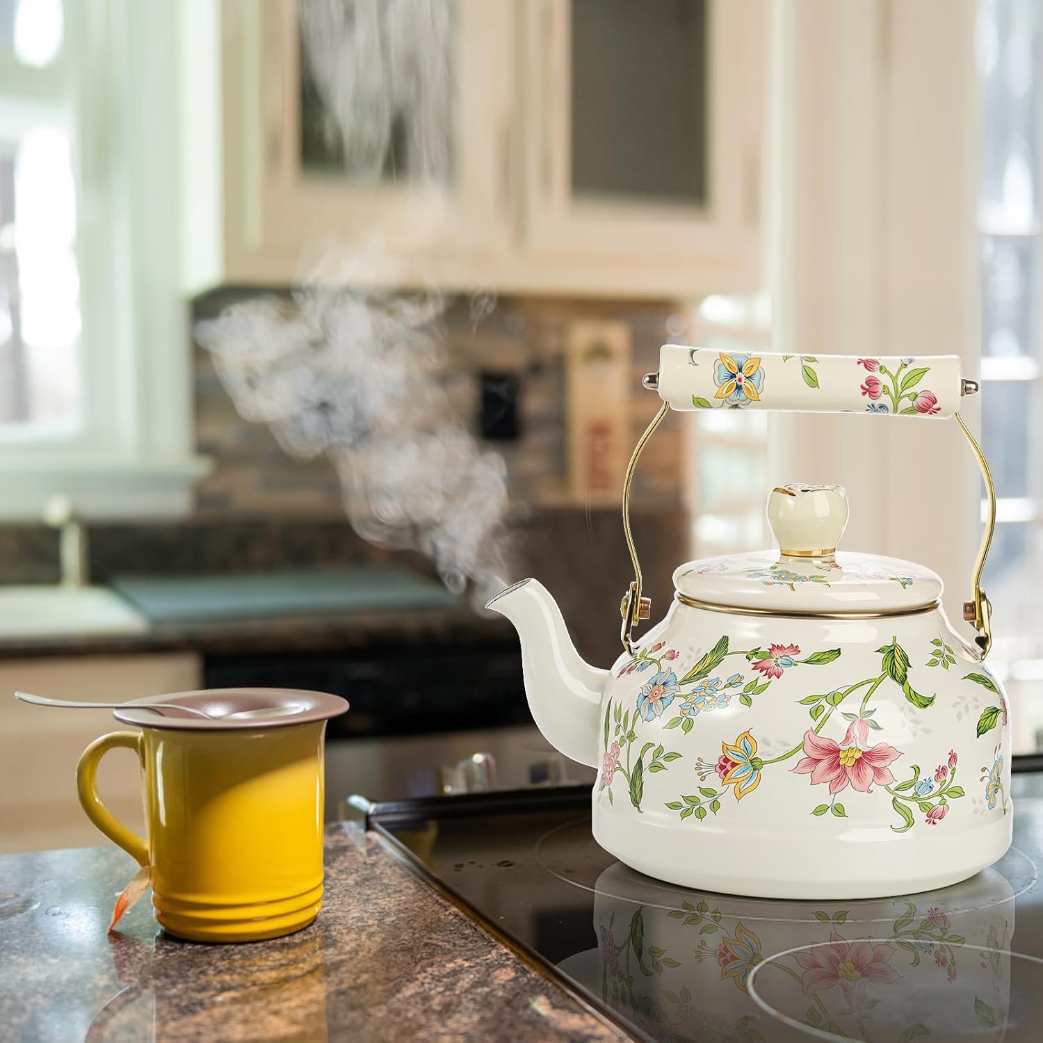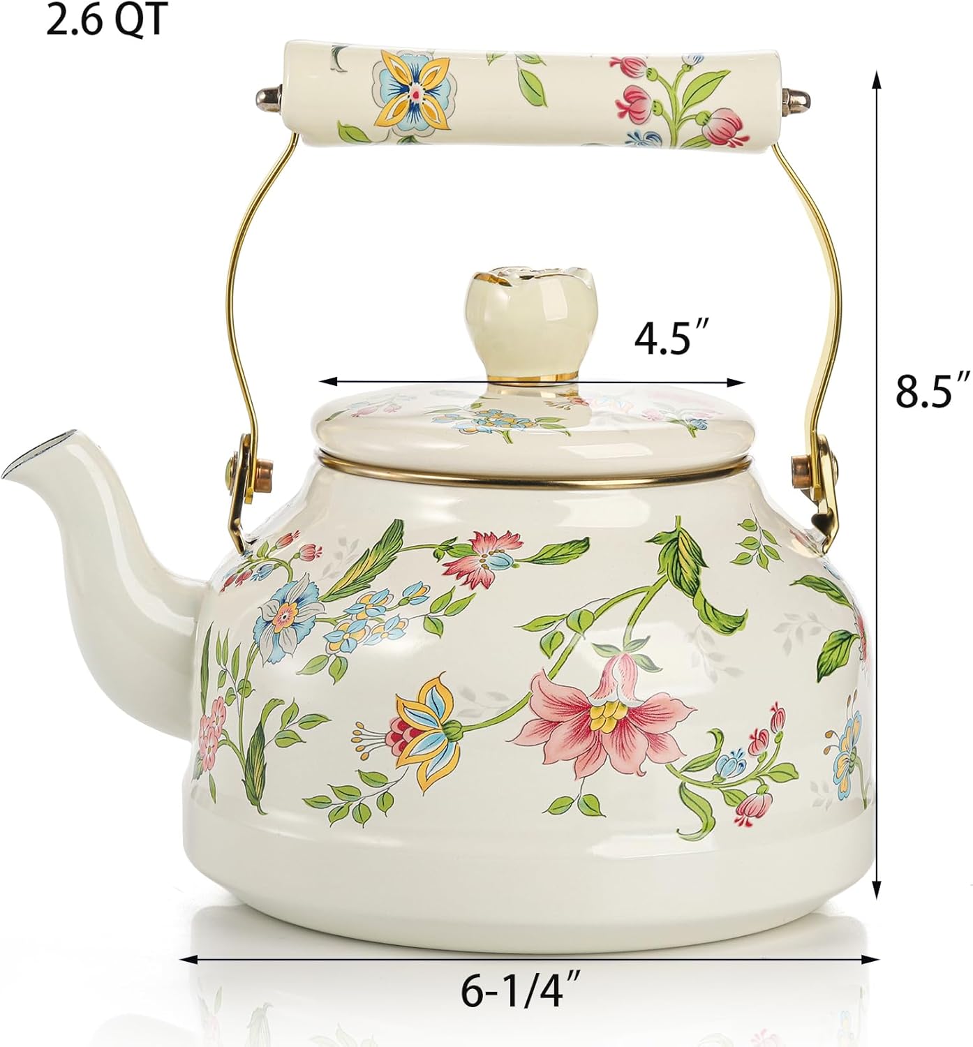Jucoan 2.6 Quart Vintage Enamel Tea Kettle, Green Floral Enamel on Steel Teapot with Cool Touch Porcelain Handle for Stovetop