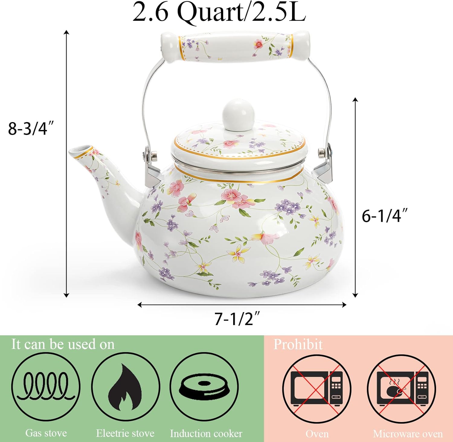 Jucoan 2.5Lteakettle are made of high-quality food-grade enamel, non-toxic, non-rusting, safe and durable, and fast heat conduction. With ceramic handle, the water kettle is comfortable to hold and easy for pouring. The colorful floral hand-printed pattern makes this water kettle classic and modern, add a beautiful and stylish look to your kitchen.