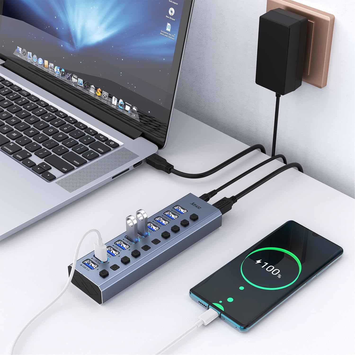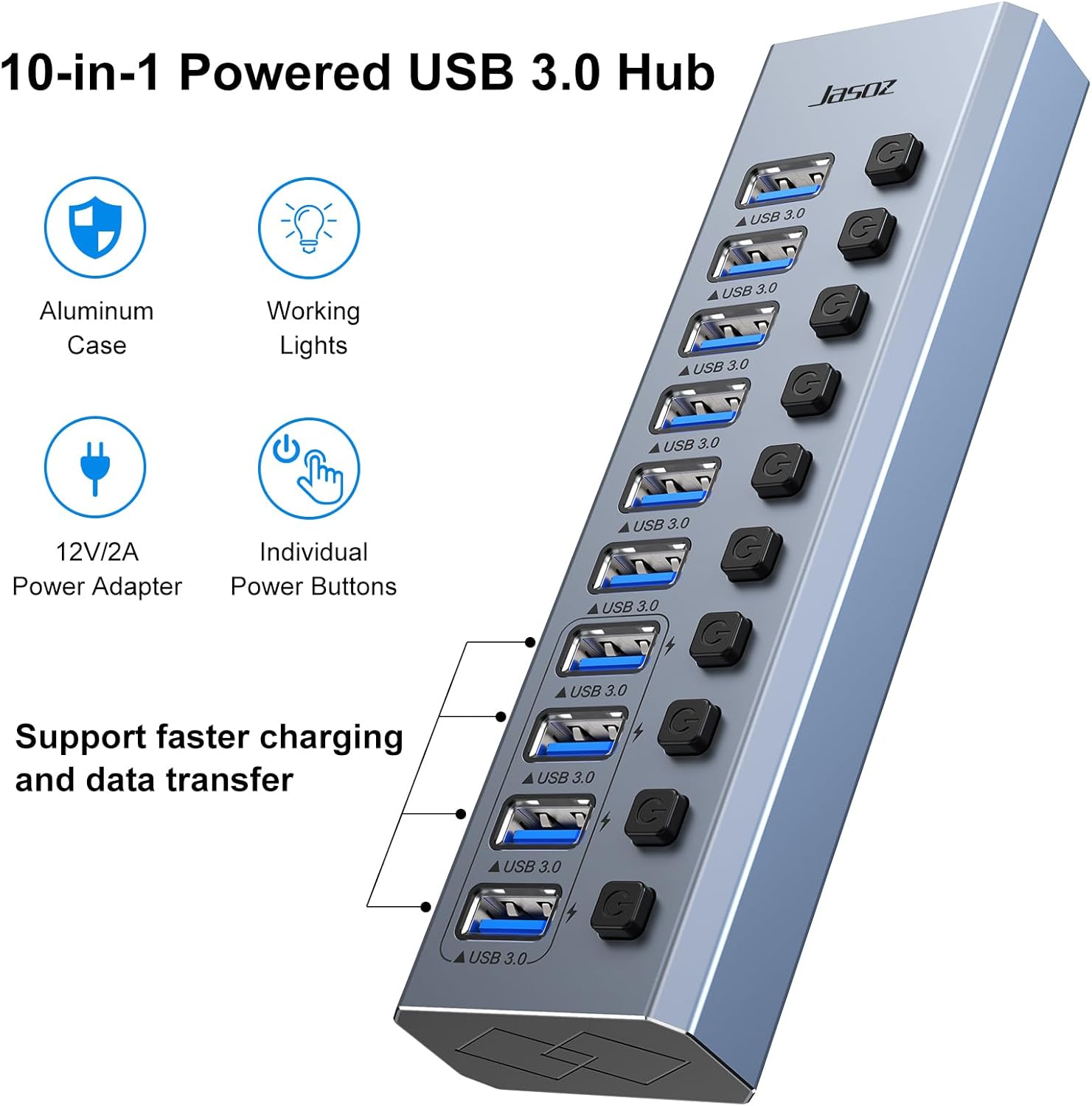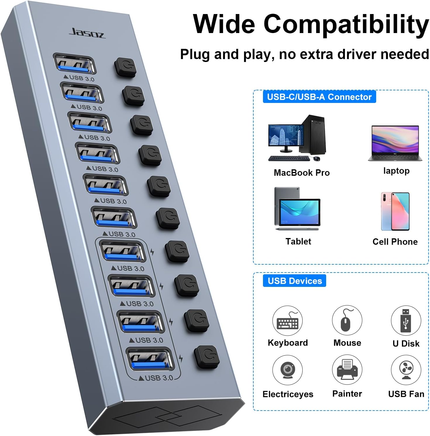Powered USB Hub: 10-port powered USB 3.0-A hub instantly adds 5Gbps USB-A 3.0 ports and 4 USB-A smart charging ports to your laptop, desktop, gaming console, etc. Fully plug-and-play, no drivers required