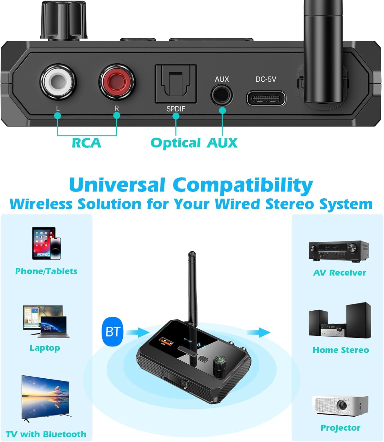 🏡 MULTI-ROOM AUDIO MADE SIMPLE: Sync multiple speakers via AUX/RCA/Optical cables for whole-home audio consistency. The Bluetooth receiver for speakers turns your living room, kitchen, and patio into a unified sound system for parties or daily vibes.