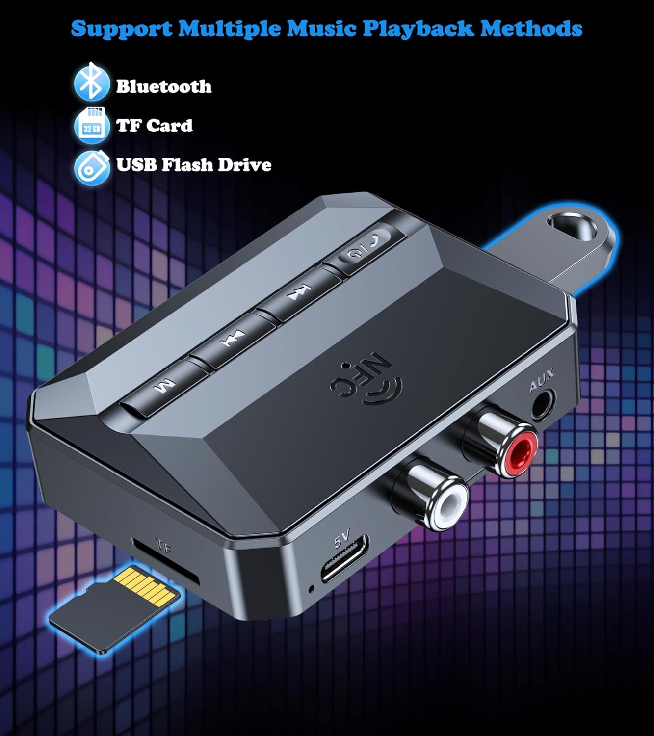 MUSIC PLAYBACK CENTER: This Bluetooth audio adapter supports three music playback modes: ①Bluetooth Mode, which allows you to stream directly from your phone, tablet, or laptop. ②USB flash drive/TF Card Playback: Play audio directly from USB drives or TF cards. ③AUX Mode: Connect via wired 3.5mm input for maximum flexibility.