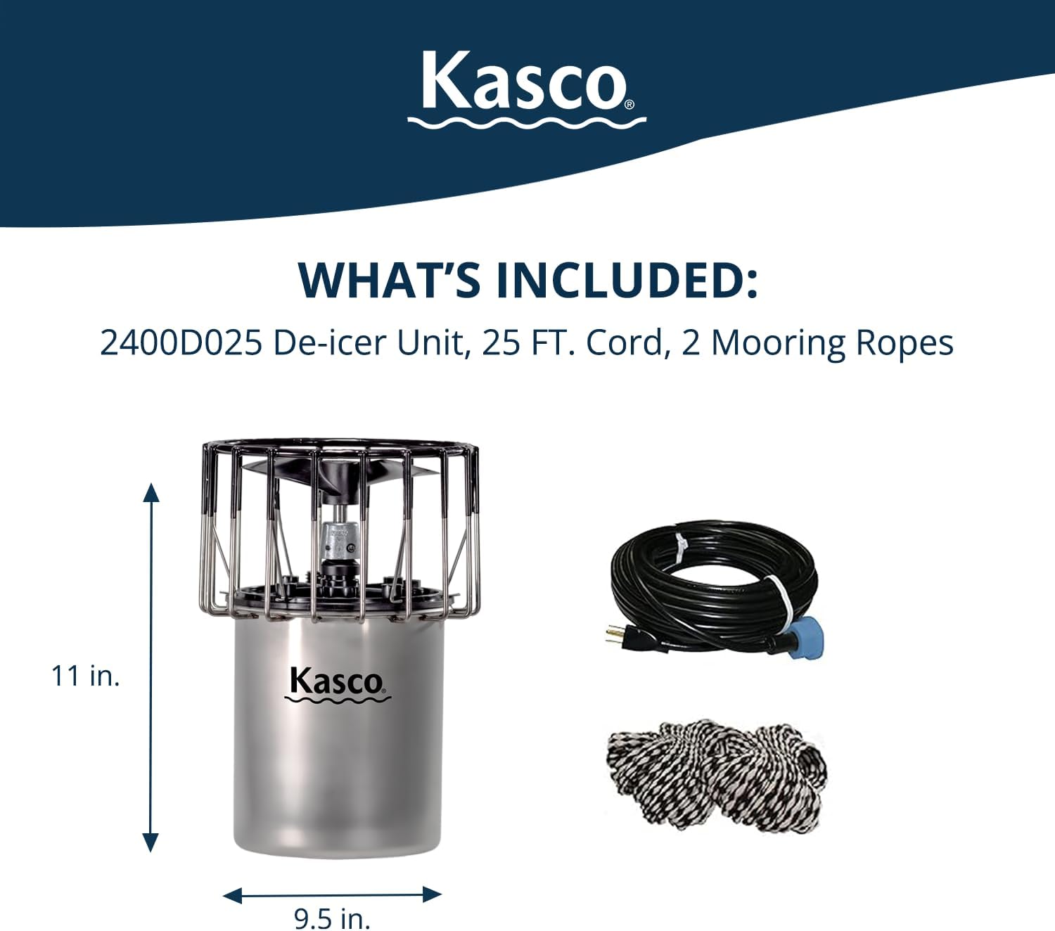 Prevent Ice Damage: 1/2 Horse Power Kasco deicer is engineered to prevent ice formation in water bodies, keeping up to a 30 to 65ft diameter of open, ice-free water depending on Air temperature. Marine Deicer includes built-in thermal overload protection, a 25 ft Electric power cord and 2 (20ft) suspension ropes.