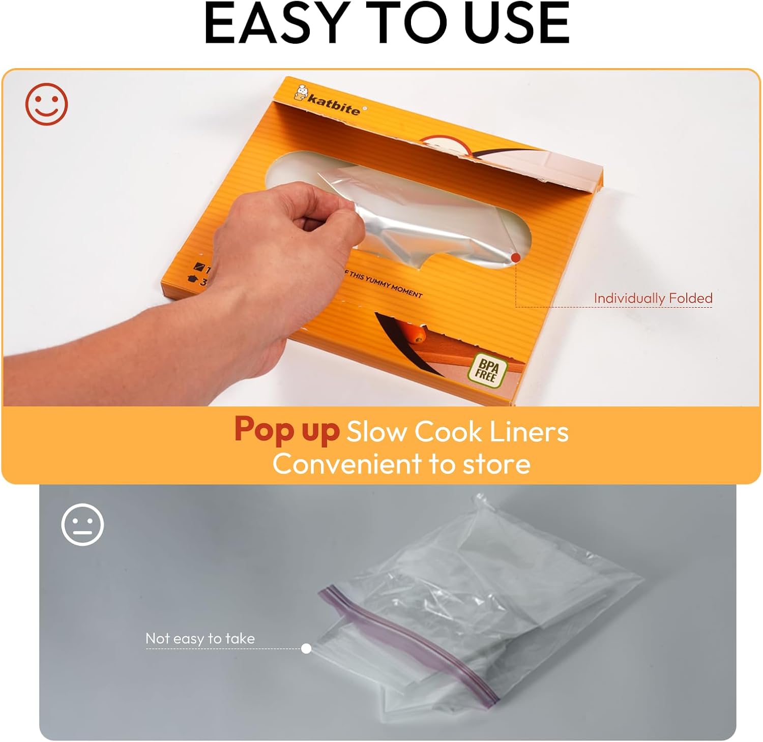 EASY POP-UP DISPENSING—Katbite Crock Pot Liners are designed to pop up for hassle-free dispensing, making it simple to line your crock pot