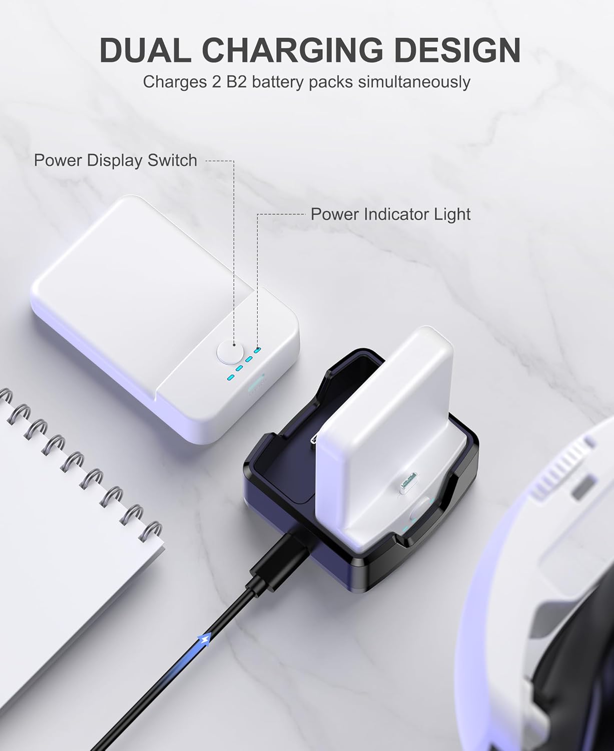 【6-8H Non-Stop Playtime – 2×7500mAh Hot-Swap Batteries + Dock】Kawaye vr headset strap has 2×7500mAh batteries (3-4H each) + charging dock. — one powers, one charges for non-stop gaming. Hot-swap in seconds: no headset removal or game pauses, great for marathons/workouts.