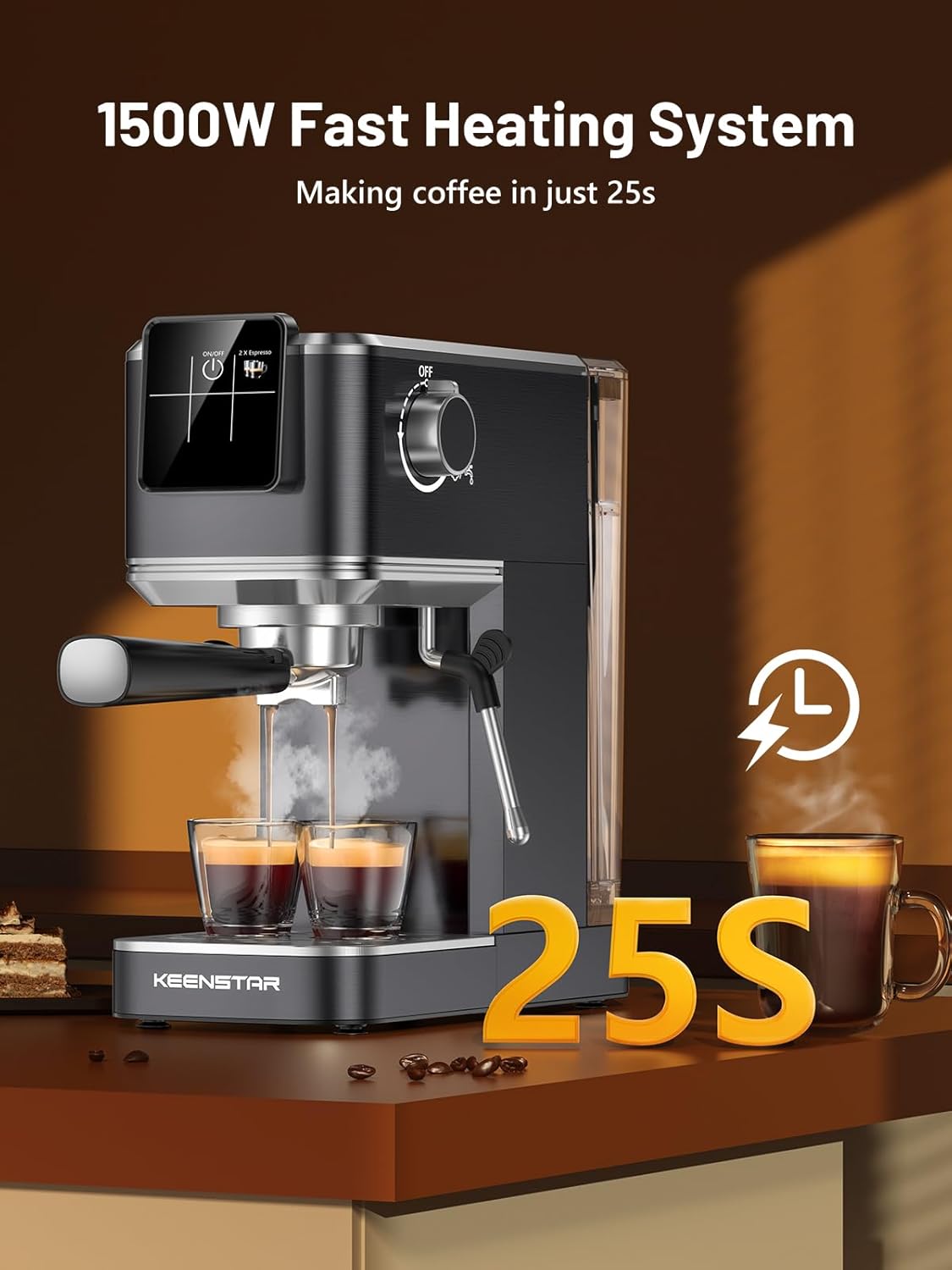 【Powerful Milk Frothing System】: Keenstar espresso machine with milk frother has a powerful steam wand, so you can texture creamy, rich microfoam milk to create amazing milk foam art and enhance the flavor of your brews. Accurate temperature control can ensure the best taste. Create your own unique milk foam art, make your favorite espresso coffee at home.