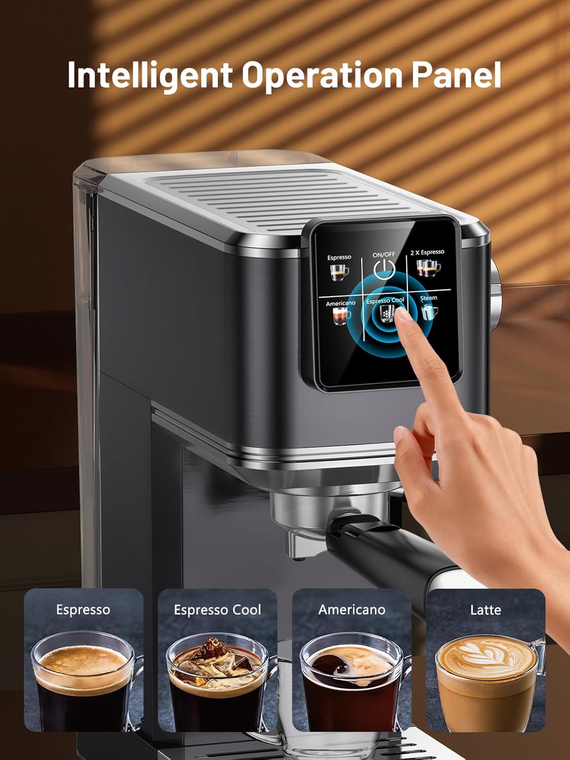 【Convenient Touch Screen】The touch screen design allows you to brew espresso, Americano or cold brew coffee with just one touch. Very easy to operate. The advanced fast heating system ensures that your espresso is ready in no time, making it easy to enjoy your coffee whenever you want.