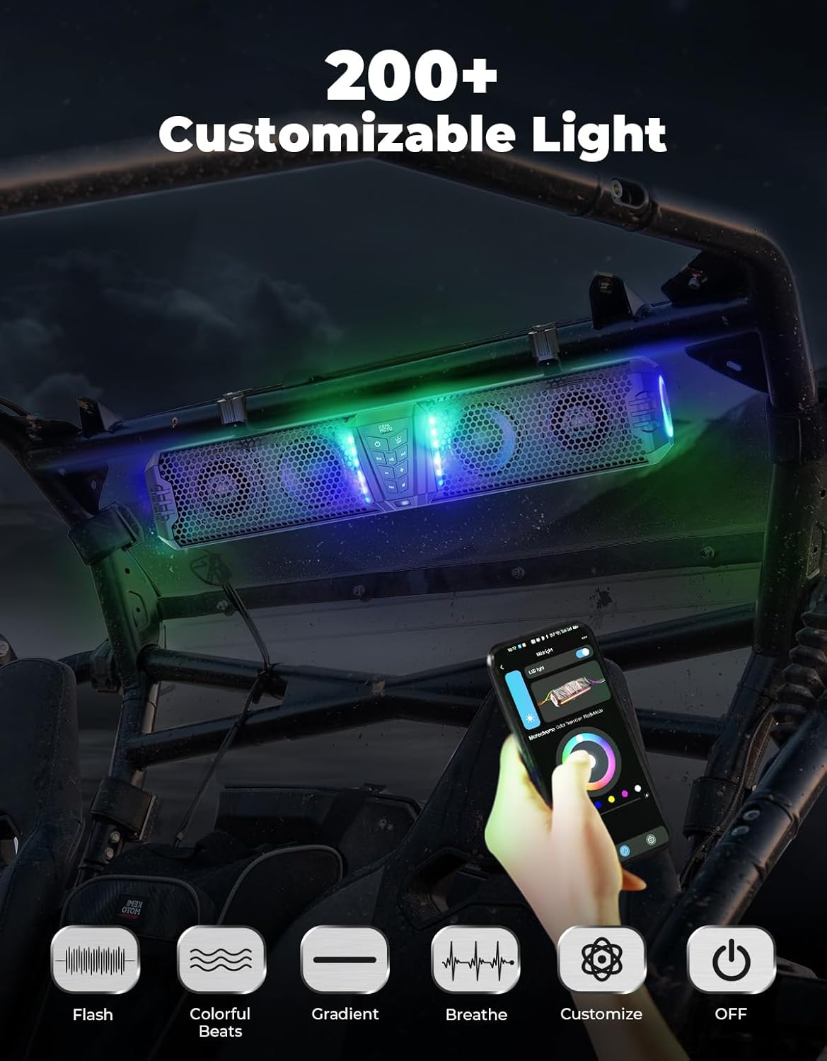 Light Up Your Ride: The KEMIMOTO Midnight 60 UTV Sound Bar brings the party with 200+ dynamic lighting modes—pulse to the beat, flash, fade, or glow. Sync LEDs to your music in Colorful Beats Mode or flip to DOME Mode for a bright white reading light. Ride, vibe, and see clearly—anytime, anywhere