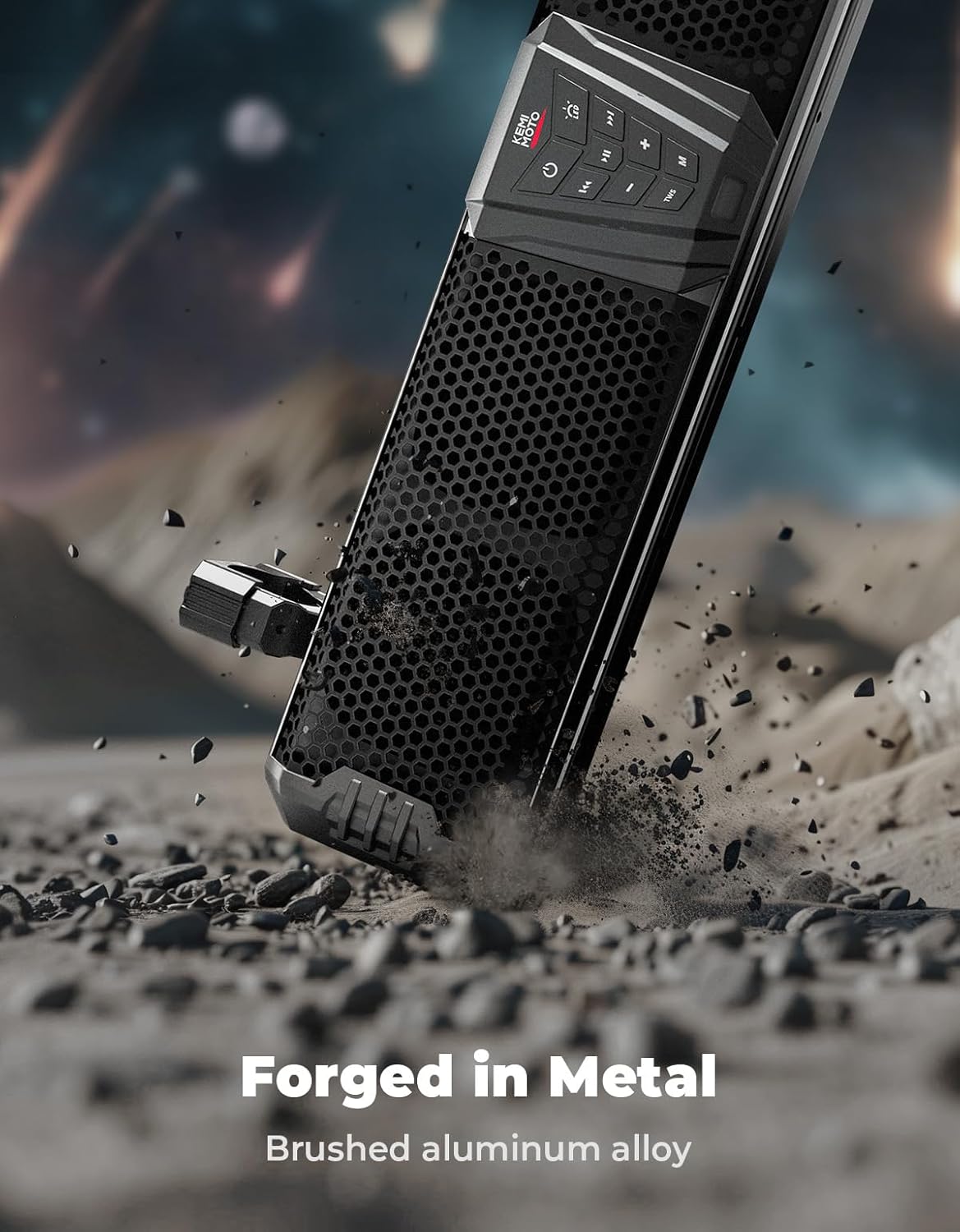 Built for Adventure: Built with marine-grade IP66 aluminum alloy, this rugged soundbar combines military-grade durability with premium audio performance. The high-density metal construction delivers superior impact resistance and heat dissipation while minimizing sound-distorting resonance. Engineered to conquer extreme conditions from -20°C to 85°C, it thrives in dust, humidity, and rough terrain where plastic soundbars fail