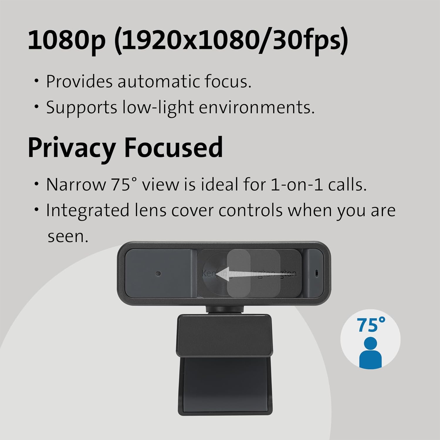 An integrated lens cover lets you easily control who sees you, and a narrow 75° diagonal field of view provides a personal and private video frame ideal for 1-on-1 calls while reducing background clutter